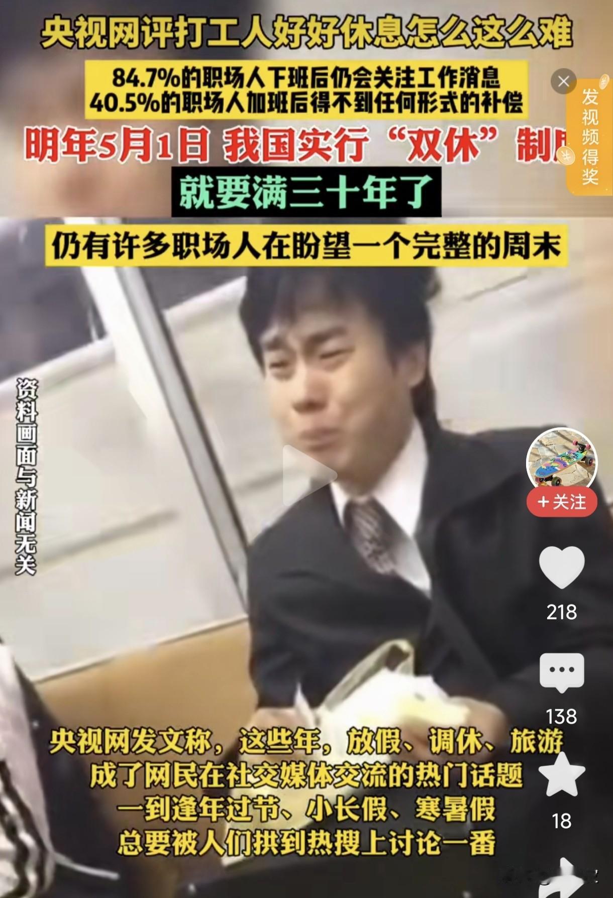 打工人好好休息怎么就这么难 太戳心了!双休快30年了,多少人还在盼一个完整周末? 说实话,看到这组数据,再看到央视网的发声,我心里堵得慌,鼻子一阵阵发酸。 咱们打工人,想安安稳稳好好休息一下,怎么就这么难? 有个扎心的事实摆在眼前:到明年5月1日,我国实行双休制度,就要满整整三十年了。 三十年啊,日子越过越好,可直到今天,还有无数职场人,连一个完完整整、不用操心工作的周末,都成了遥不可及的奢望。 数据不会骗人:84.7%的职场人,就算下了班,也根本不敢放下手机,必须时刻关注工作群的消息,生怕漏了一条通知,就被贴上“不负责任”的标签; 更让人寒心的是,40.5%的职场人,熬了无数个夜加的班,到头来,得不到任何形式的补偿,加班费没有,调休也不给,一句“年轻人多吃点苦”,就把所有的付出一笔带过。 也难怪央视网都忍不住发文评论,这些年,放假、调休、旅游,只要沾上边,必定会被网友拱上热搜,逢年过节、小长假,更是次次都能吵翻了天。 为什么?因为这每一个话题,都精准戳中了咱们打工人最痛的那根神经啊! 我就想问一句: 双休,是法律明文规定的劳动者权利;八小时工作制,是写进法条里的规矩;加班给补偿,是天经地义的事。 怎么到了今天,这些本该人人都有的基本权利,反倒成了很多人求而不得的“福利”? 有的公司,明目张胆地搞单休、大小周,你敢提双休,他就敢说你“不适合奋斗”; 有的公司更鸡贼,明面上写着双休,实际上24小时随时待命,下班了消息必须秒回,周末一个电话,你就得立刻打开电脑干活,稍微慢一点,帽子就扣下来了; 更过分的是,你按规定拒绝无偿加班,他转头就给你穿小鞋、降绩效,甚至找个莫须有的理由,就把你给开了。 咱们打工人出来上班,是为了好好生活,不是为了把自己的一辈子,都卖给公司啊! 我们不是怕吃苦,不是不愿意奋斗,我们只是不想被人用“奋斗”当幌子,光明正大地压榨,连最基本的休息权都被剥夺干净。 我们要的从来不多,只是下班了,就能踏踏实实做回自己,不用再被工作绑架;只是周末了,能陪陪家人、做点自己喜欢的事,不用24小时抱着手机待命;只是加了班,能拿到本该属于我们的补偿,而不是一句轻飘飘的“辛苦了”。 三十年了,双休制度落地都快三十年了。 真心希望,别再让“好好休息”,成为打工人的奢侈品。 真心希望,每一个努力奋斗的打工人,都能拥有一个完整的、不用操心工作的周末,都能踏踏实实地,享受法律赋予我们的休息权。 最后想问一句大家:你现在能拥有完整的双休吗?下班之后,还需要随时盯着工作消息吗?评论区里,咱们一起聊聊。
