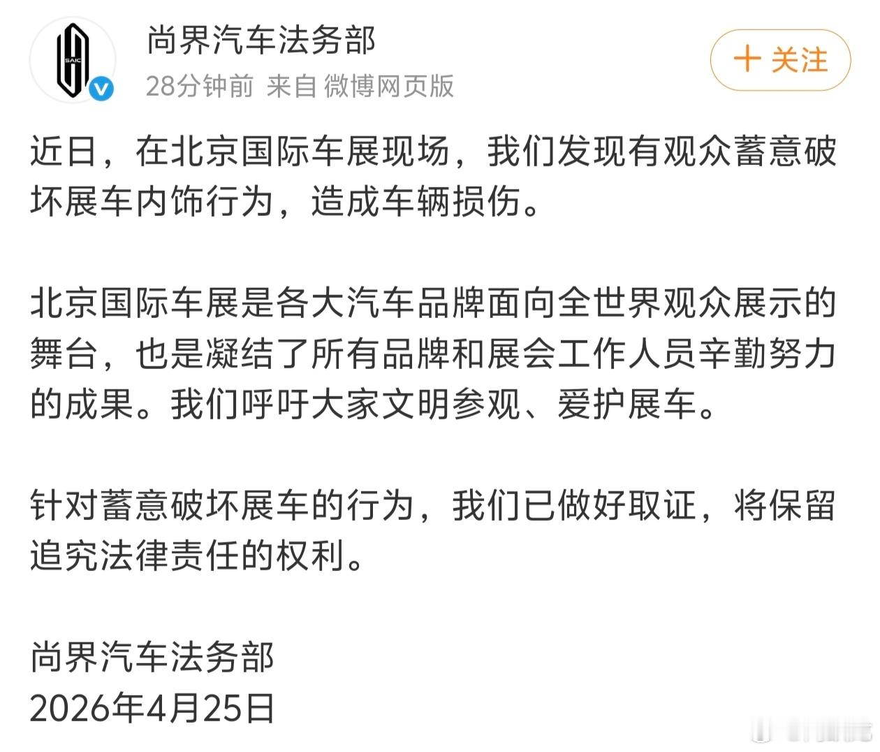 看到尚界汽车法务部发布的声明,我心里五味杂陈。作为北京国际车展这样全球瞩目的行业盛会,展车是品牌数月打磨的心血结晶,是无数工程师、设计师和工作人员努力的成果,更是面向世界展示中国汽车工业的窗口。蓄意破坏展车内饰的行为,不仅是对他人劳动成果的漠视,更是对公共秩序和行业尊严的践踏。文明观展,本应是每一位观众的基本素养。车展不是宣泄情绪的场所,展车也不是可以随意破坏的试验品。这种恶意损坏,不仅给品牌造成了直接的经济损失,更让所有认真对待车展、尊重规则的观众感到寒心。尚界汽车选择通过法律途径维权,既是维护自身权益,也是在为整个行业发声,守护每一份对汽车的热爱与尊重。声援尚界汽车,也呼吁所有观展者守住文明底线。任何行业竞争,都应在规则和尊重的框架内进行,恶意破坏只会暴露自身的狭隘与失德。北京车展承载着中国汽车产业向上的希望,我们更应共同维护这份秩序与体面。希望涉事者能承担应有的责任,也愿所有车企的努力都能被温柔以待,让每一份用心,都不被辜负。