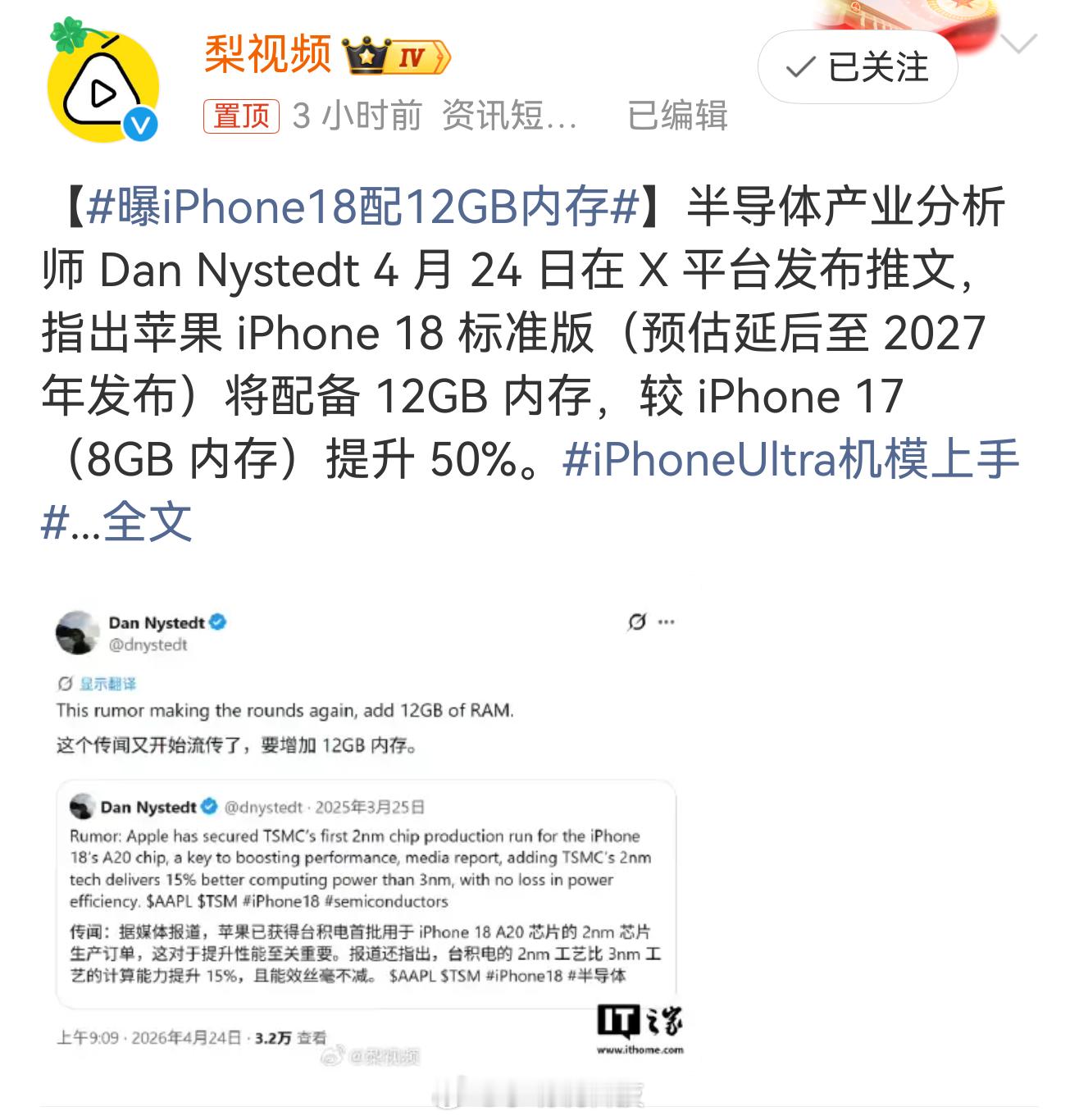 曝iPhone18配12GB内存 苹果这次把牙膏挤爆了!iPhone18直接把内存干到12G,真的开窍了。要是配置升级了价格还不涨,那还不得卖爆!