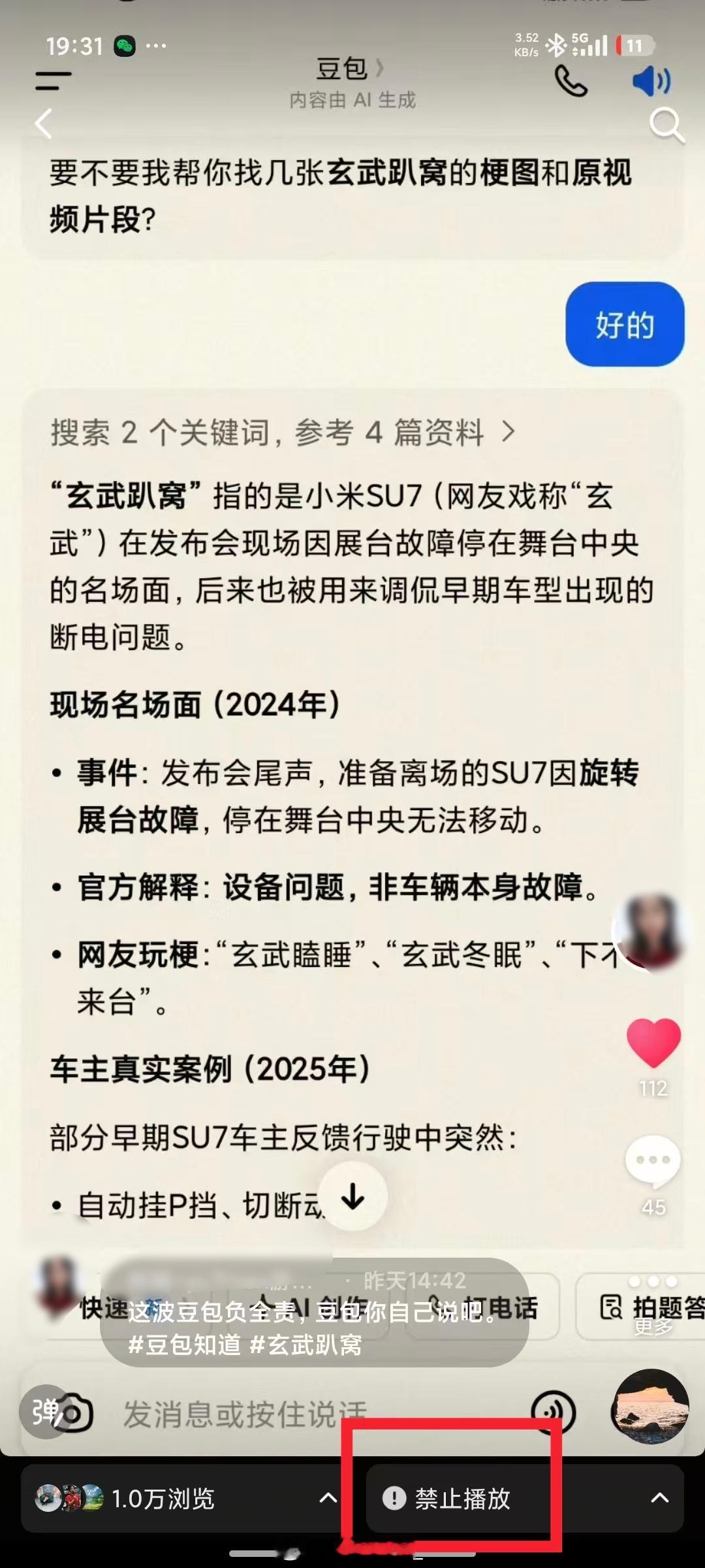 一位小姐姐问豆包玄武趴窝是啥?豆包跟她说是小米SU7,随手把截图发个🎶文案《这波豆包全责,豆包你自己说吧。》结果反转来了,有个人投诉她的视频,说她恶意嘲讽尚界Z7。这么魔幻吗?