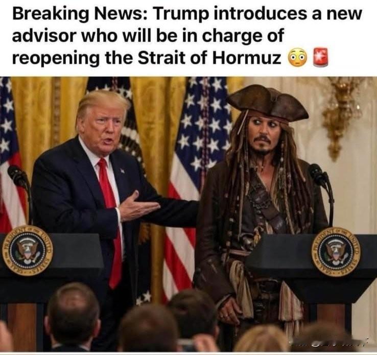 一位来自犹他州盐湖城的美国网民说,“美国应当牢牢控制霍尔木兹海峡,因为此地的战略意义太重要了,绝不能交由其他任何势力把控。”这个名叫“我爱美国新闻”的人士是特朗普的铁杆粉丝,他说自己的帖子曾经4次被特朗普总统转发,9次被马斯克转发,现在已经有14万人关注,是正宗的美国大V。他这次发了一张特朗普正式任命“加勒比海盗”中的杰克·斯帕罗船长为白宫顾问的照片,要他负责重新打通霍尔木兹海峡。据称,杰克船长海上经验丰富,黑白两道都能通吃,更重要的是,他对特朗普总统和美国政府忠心耿耿。