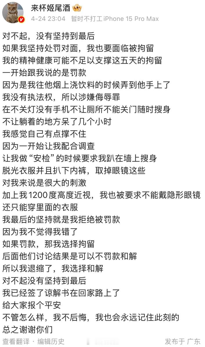 最后博主表示,由于担心自己的精神健康状况无法承受五天的拘留,最终选择了和解,没有坚持要求处罚对方。