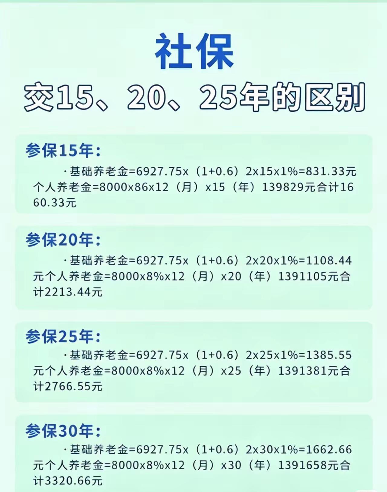 社保交15年、20年、25年、30年,[苦瓜]退休金差距到底有多大?划算吗? 很多人交社保,都卡在最低15年就不想继续交了,看完真实养老金差距,瞬间清醒。 按照当下通用养老金计算标准,同样月薪8000元,退休后每月到手养老金天差地别。 社保交满15年,每月退休金合计仅1660.33元; 交满20年,每月能领2213.44元,直接多了500多; 交满25年,每月养老金来到2766.55元,比15年整整多拿1100元; 坚持交到30年,退休每月稳稳领取3320.66元。 缴费年限每多5年,退休工资直接上一个台阶,晚年生活质量完全不在一个档次。 很多人纠结,交社保到底划不划算?这里一句大实话讲明白: 如果你的个人理财投资,常年能稳定做到年化收益率20%以上,那自己存钱理财,确实比交社保划算。 可绝大多数普通人,根本达不到这个收益。银行存款、普通理财年化大多3%-4%,既跑不赢通胀,也没有终身兜底保障。 社保是国家给普通人的终身养老兜底,活多久领多久,每年还会跟着社会工资上调涨钱,生病还有医保兜底。对于90%的普通人来说,长期缴纳社保,绝对是稳赚不赔的养老选择。 你社保已经交了多少年?觉得交社保划算吗?评论区聊聊你的看法。
