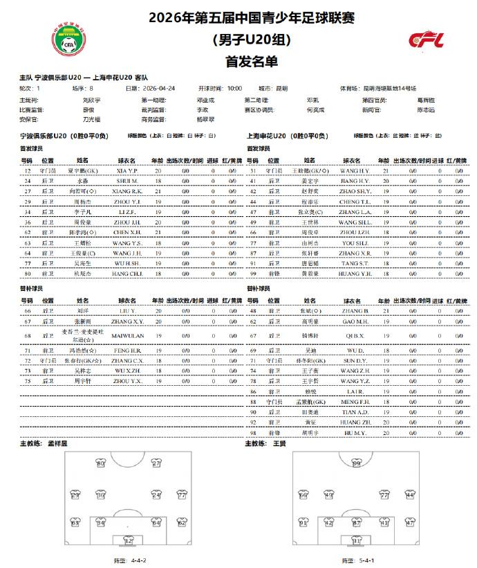 中青赛U20|排位赛第一轮:上海申花1-1宁波俱乐部 4月24日10:00 ,2026年第五届中国青少年足球联赛(男子U20组)排位赛第一轮上海申花对阵宁波俱乐部的比赛在云南昆明海埂基地进行。比赛第10分钟,宁波队利用角球二点机会率先破门。第87分钟,申花边路起球,赵舒奕中路高高跃起头球破门,最终上海申花1-1战平对手。4月26日15:00,申花将迎战第2轮对手温州俱乐部。