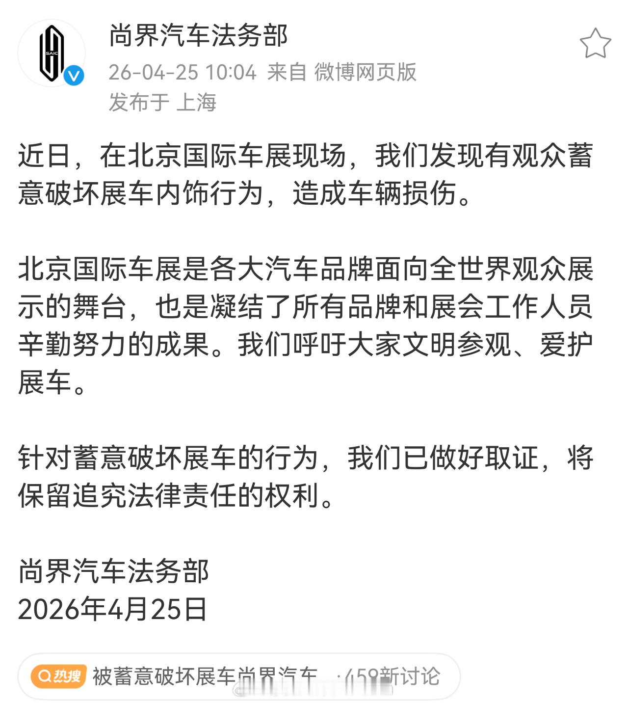 还是挺婉转的,有些“人”,也不太能称为“观众”。就差带工具来现场拆车了。被蓄意破坏展车尚界汽车法务部发文
