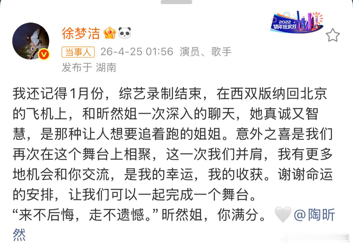 徐梦洁说昕然姐你满分 旅途当中的深夜谈心最容易拉近人心,徐梦洁和陶昕然就这样慢慢走进彼此生活,离别之际走心发文,满是不舍和由衷赞美。