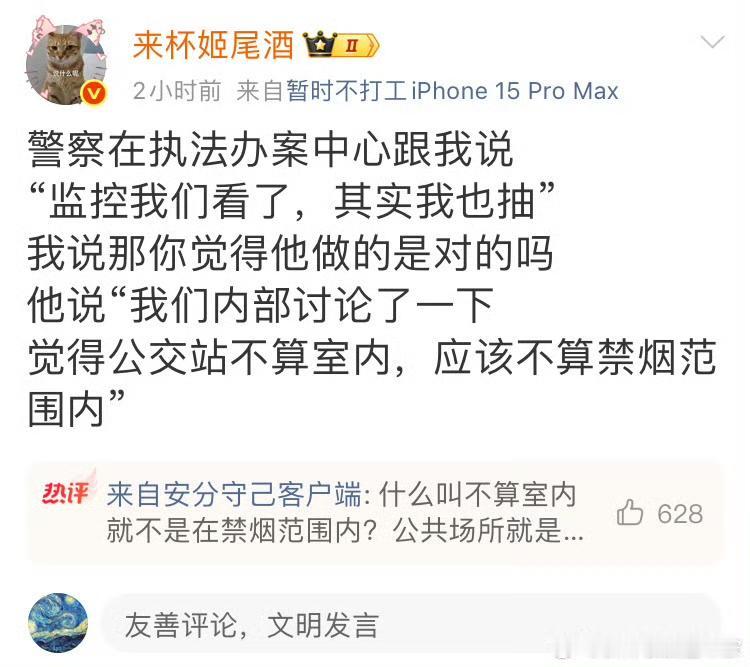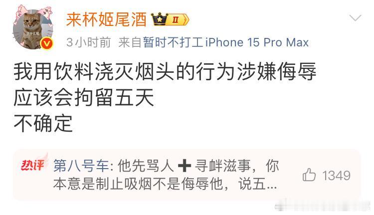 深圳一女子公交车站阻止男子吸烟,发生冲突,可能面临被拘留。一个 ID 叫来杯姬尾酒的女生,和妹妹在公交车站等车,一个男子就在他们旁边肆无忌惮的吸烟。女子本想躲开,但是烟雾的味道似乎追着来,实在忍受不了,就要求男子掐灭烟头,男子不听,女子就和男子说公交车站不能吸烟,男子回怼说公交车站没有禁止吸烟的标识。女子继续说,公交车上还没有不允许裸奔呢,你怎么穿的衣服?男子听到这句话,瞬间破防了。 两人冲突升级,女子情绪激动,用随身的饮料浇灭了男子的烟头。男子随即捡起半瓶饮料还击,扔到女子身上。随后双方报警,女子以为警察会支持她的正义之举,没想到警察经过研究认为公交车站不属于公共场合,换句话说男子在那里有吸烟的自由。如果女子接受调解,他们两个双方道歉,互相赔偿双方的损失就可以了。如果不接受道歉,女子可能因为涉嫌侮辱面临拘留。这让女子害怕了,因为她从来没有经历过拘留所待几天的情况,没有做好心理的准备,最新消息他们和解了。 刚刚深圳4 月发布了最严共控烟条例,指出各种公共场合禁止吸烟,违反的要最高罚款 500 块,不知道公交车站是不是包含在里面。
