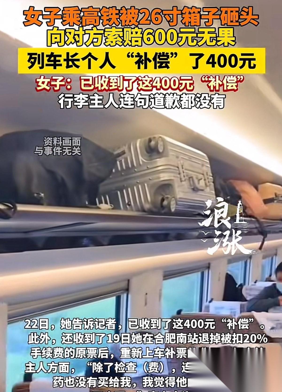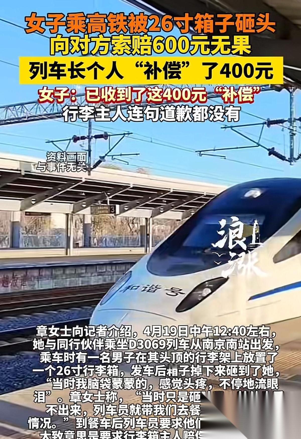 江苏南京,一大学生乘坐高铁去旅游,上车后,突然从头顶上坠落一26寸行李箱,女子被砸的头晕眼花,疼痛难忍,眼泪止不住地往外淌。 砸人的乘客姓杜。事发后,他倒是陪着姑娘中途下车去医院拍了脑部CT。结果大夫一看,说只是擦破点皮。这位杜某彻底松了口气,立马掏出一百块钱,想赶紧把这事儿打发了。 姑娘当然不干。好好的假期全毁了,人还被迫滞留在外地,吃住全变成了额外的花销。她拉了笔账,要六百块钱当补偿。 这下杜某急眼了。 他不仅一分不想掏,反而嚷嚷着姑娘是在敲竹杠,甚至丢下一句:“想索赔?找列车员去。”最后还是列车方出面,给姑娘退了票,又拿出四百块钱兜底,风波才算暂时压住。 站方花钱买了安宁,但这事儿不能就这么糊弄过去。仔细看这个杜某的操作,满脑子都是侥幸。 一开始带人看病,看着挺负责,那其实是被吓住后的心虚。 26寸的大箱子砸脑袋上,万一真砸出个好歹,医药费可是个大坑。 等大夫一句“没事”出口,他那点算计就全露出来了。一百块钱就想买断所有责任,连句诚心诚意的道歉都不愿给。 不少人犯了错,总喜欢拿“没伤筋动骨”当借口,来逃避后续的赔偿。 但这账不能这么算。 你带那么大的箱子出门,没放稳砸了无辜乘客,这责任你就得认到底。人家姑娘好端端坐着挨了一顿砸,假期没了,还得倒贴外地的吃饭打车钱,这都是真金白银的损失。 姑娘要六百块多吗? 这点钱不仅不过分,简直是最底线的维权。 列车方拿钱安抚,那是人家在做服务保障,这绝对不能成为肇事者推卸责任的理由。 想看一个人骨子里有没有底线,别看他心惊胆战时的那点殷勤。 得看危机解除后,他的真实嘴脸。 为了省几百块钱,完全不顾别人的糟心,倒打一耙还要斤斤计较。这种做派,赢了私利,却输净了体面。 对此,你怎么看?