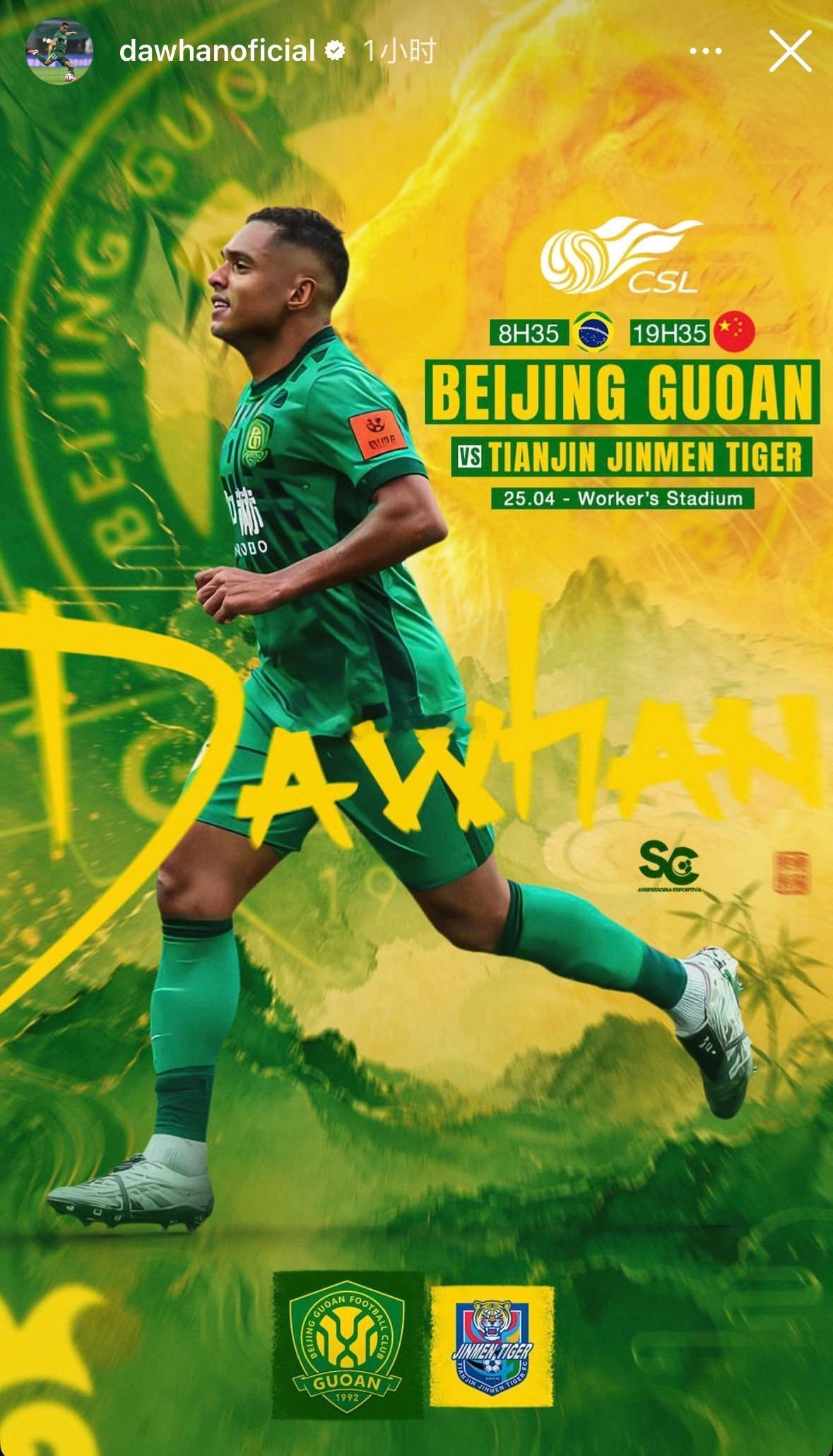 国安球员达万发布今晚京津大战赛前海报。