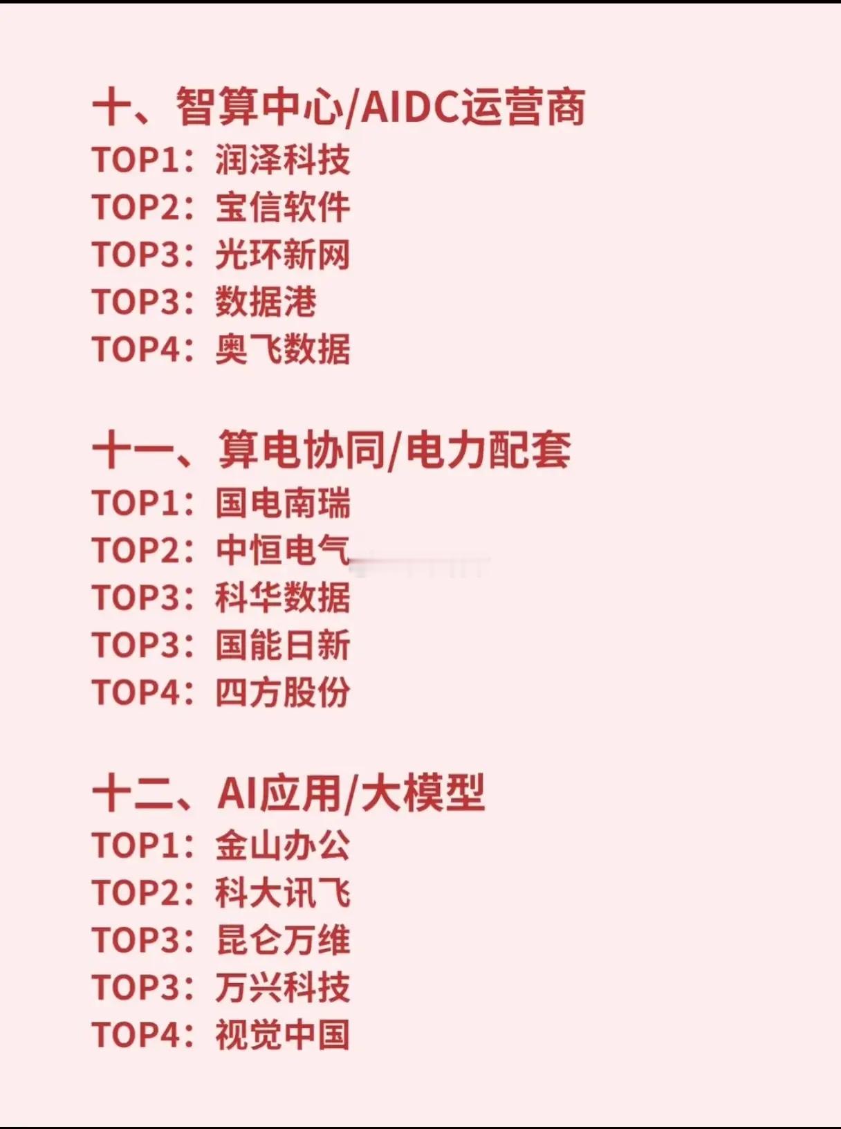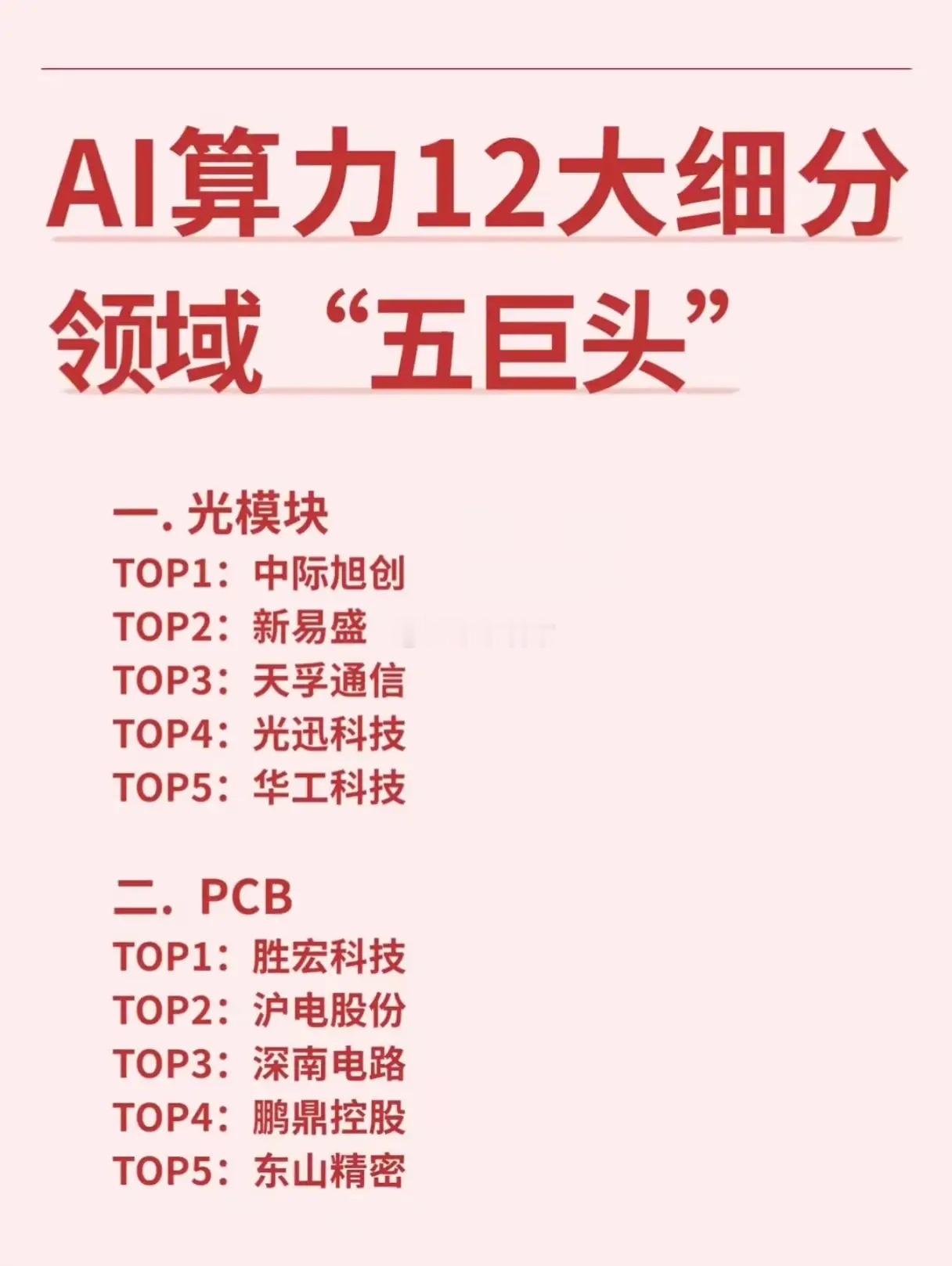 从“堆芯片”到“抢细分”:AI算力的12大赛道,谁才是真正的“定海神针”?2026年的AI算力赛道,早已不是单纯拼“大模型参数”的时代。当推理算力占比首次突破70%,一场从上游硬件到下游应用的“全链条军备竞赛”,正在12大细分领域悄然打响。在这场竞赛里,光模块是当之无愧的“数字血管”。中际旭创、新易盛等龙头早已不是传统模块的玩家,华为发布的单波1.6T硅光模块、光迅科技的3.2T硅光NPO方案,正把中国厂商推向全球高速光通信的技术前沿。硅光技术的渗透率在1.6T模块中已达70%以上,功耗降低40%的同时,也让这些企业在算力传输的“高速公路”上筑起了护城河。而液冷散热则成了决定AI集群生死的“生命线”。随着单机柜功率向兆瓦级迈进,英维克、网宿科技等企业的技术突破,正在改写行业规则。曙光数创发布的MW级相变浸没液冷整机柜,将PUE降至1.04以下,散热效率是传统方案的3-5倍。当AI服务器的液冷渗透率即将突破50%,谁能把“算力的温度”降下来,谁就能吃下未来高密度智算中心的最大蛋糕。从PCB、AI芯片到算力租赁、大模型应用,12大赛道环环相扣,没有一个环节能独善其身。寒武纪、海光信息在国产AI芯片上的持续突破,浪潮信息、工业富联在服务器领域的规模化优势,再到金山办公、科大讯飞在应用端的场景落地,共同编织起一张覆盖全产业链的算力网络。今天的算力竞争,早已不是单点突破就能取胜的游戏。每一个细分领域的龙头,都是产业链上不可或缺的齿轮。当“词元通胀”带来的推理算力需求井喷,这些扎根技术、深耕场景的企业,才是支撑中国AI算力行稳致远的“定海神针”。