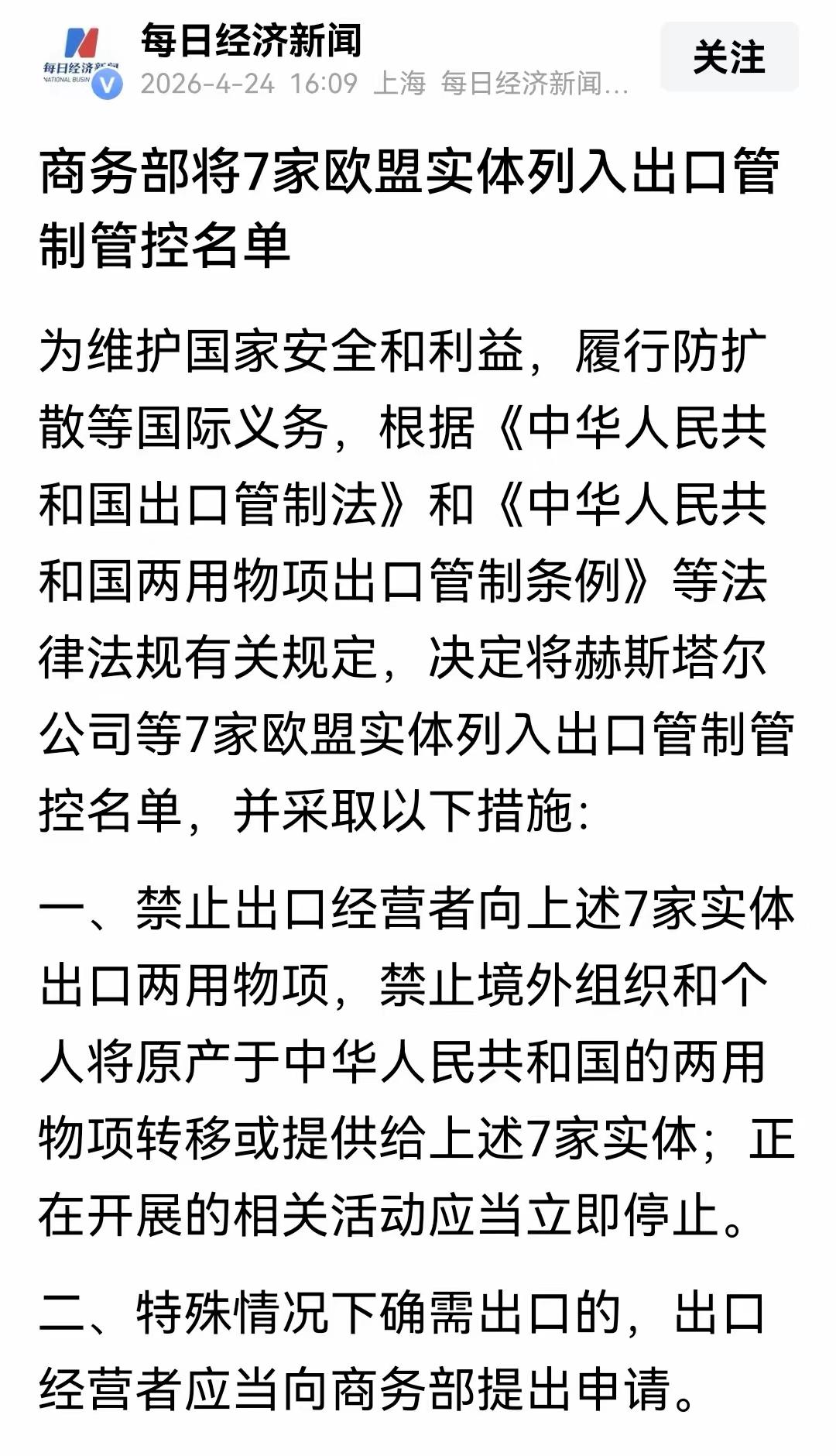 4月23日欧盟将6家中国公司列入制裁名单,今天4月24日商务部将7家欧盟实体列入出口管制管控名单。 在我看来,早就该重拳出击制裁欧洲了,他们还以为现在是欧美主导下的世界,随随便便就能制裁中国企业,他们错了现在已经是东升西降了,不但中国不会再惯着欧洲,美国也不会再惯着欧洲,让他们享受二战的胜利果实! 第一个不会放过欧洲的就是美国,欧洲占了太多太多美国和中国的便宜,但是他们不但不感恩,还天天想着取代美国拿捏中国,现在美国终于回过来味了,要第一个把欧洲摆上餐桌,从此以后再也不会看到高福利的欧洲,只会看到一个比非洲更悲惨的欧洲,这就是傲慢自大的欧洲人应得的! 我们必须要支持国家制裁欧洲,总的来说欧洲这些年占尽了我们中国人的便宜,但是他们却要第一个打压我们,所以我们必须要让欧洲人知道,没有我们中国人就没有欧洲人的高福利的幸福生活,要让他们认清楚现实!