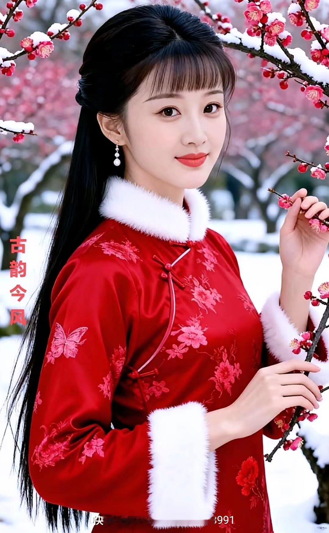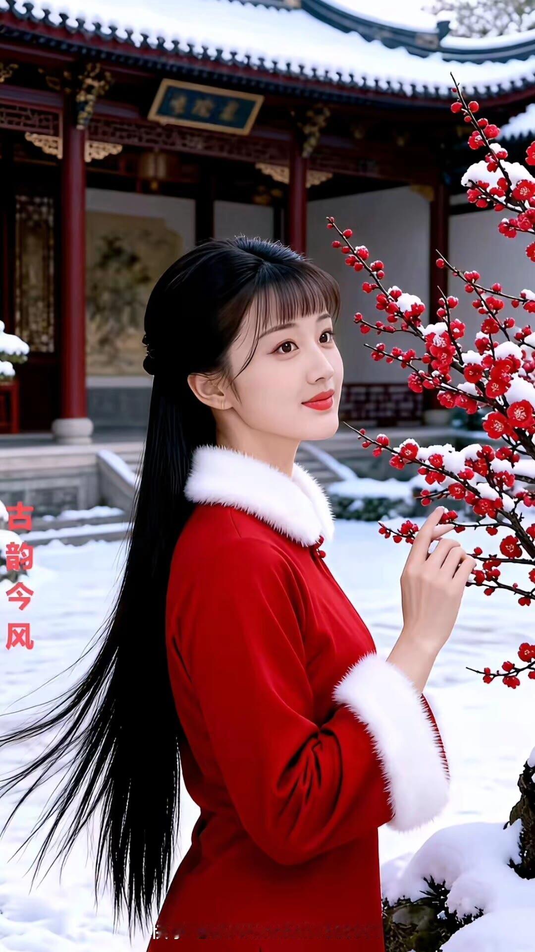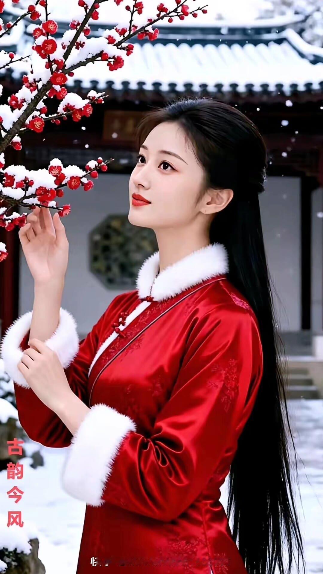 红衣美人倚雪枝,玉佩轻摇似有情。