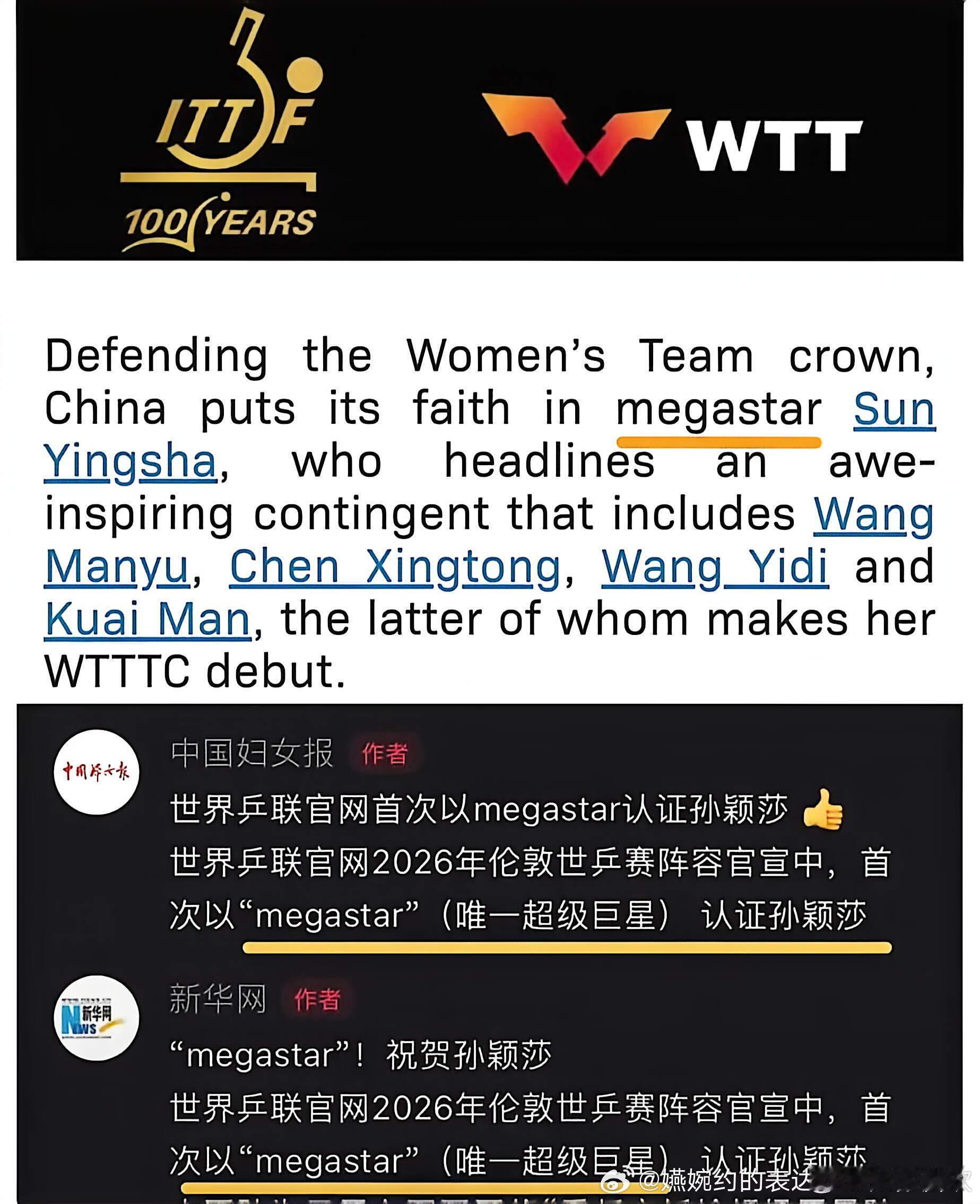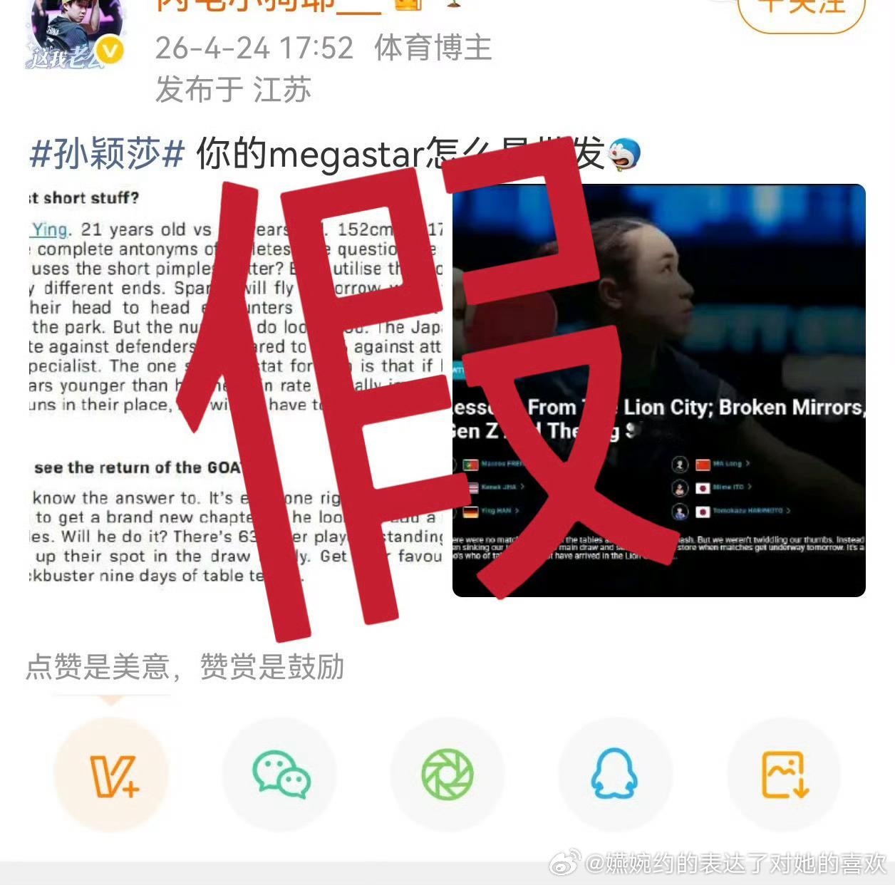 一方面眼馋孙颖莎的megastar管自己叫superstar,一方面帮🇯🇵吹假比有Japanese限定词假东西,这我能懂王楚钦粉丝不megastar孙颖莎