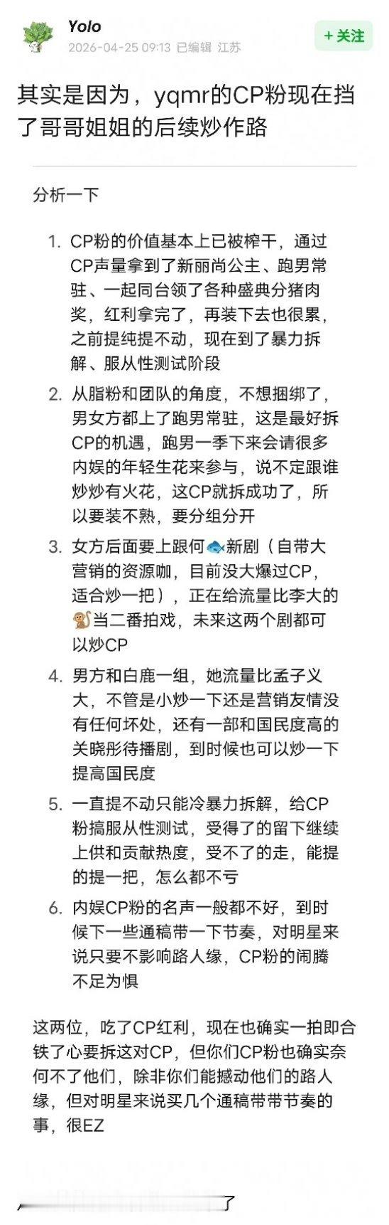孟子义李昀锐下定决心拆cp的原因这个分析明显不合理,尚公主还没播呢,剧播不还是要炒作CP吗?之前的剧宣营销点除了CP就没有什么了,说明CP营销是重点。说不好听的,你们单人的知名度远不如合体热度,认清现实吧。