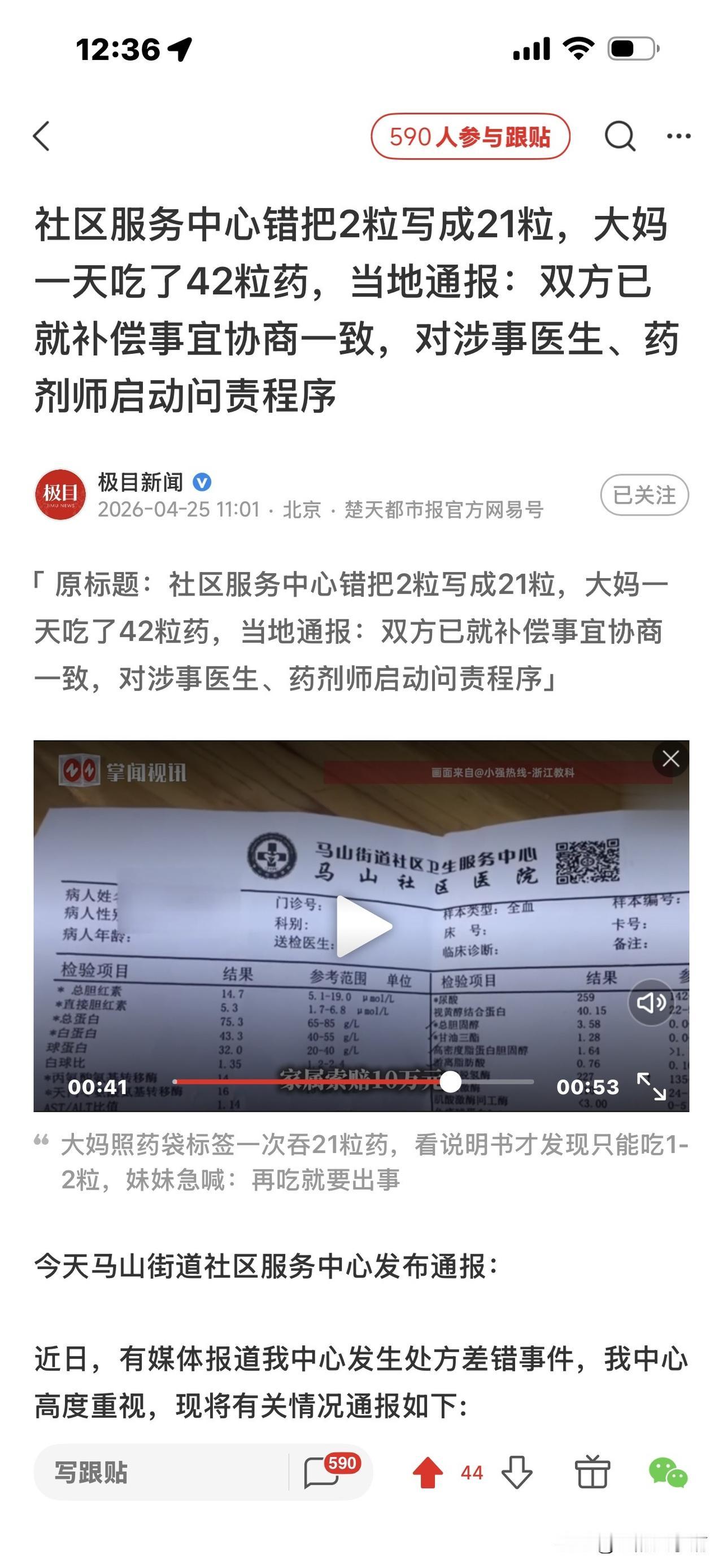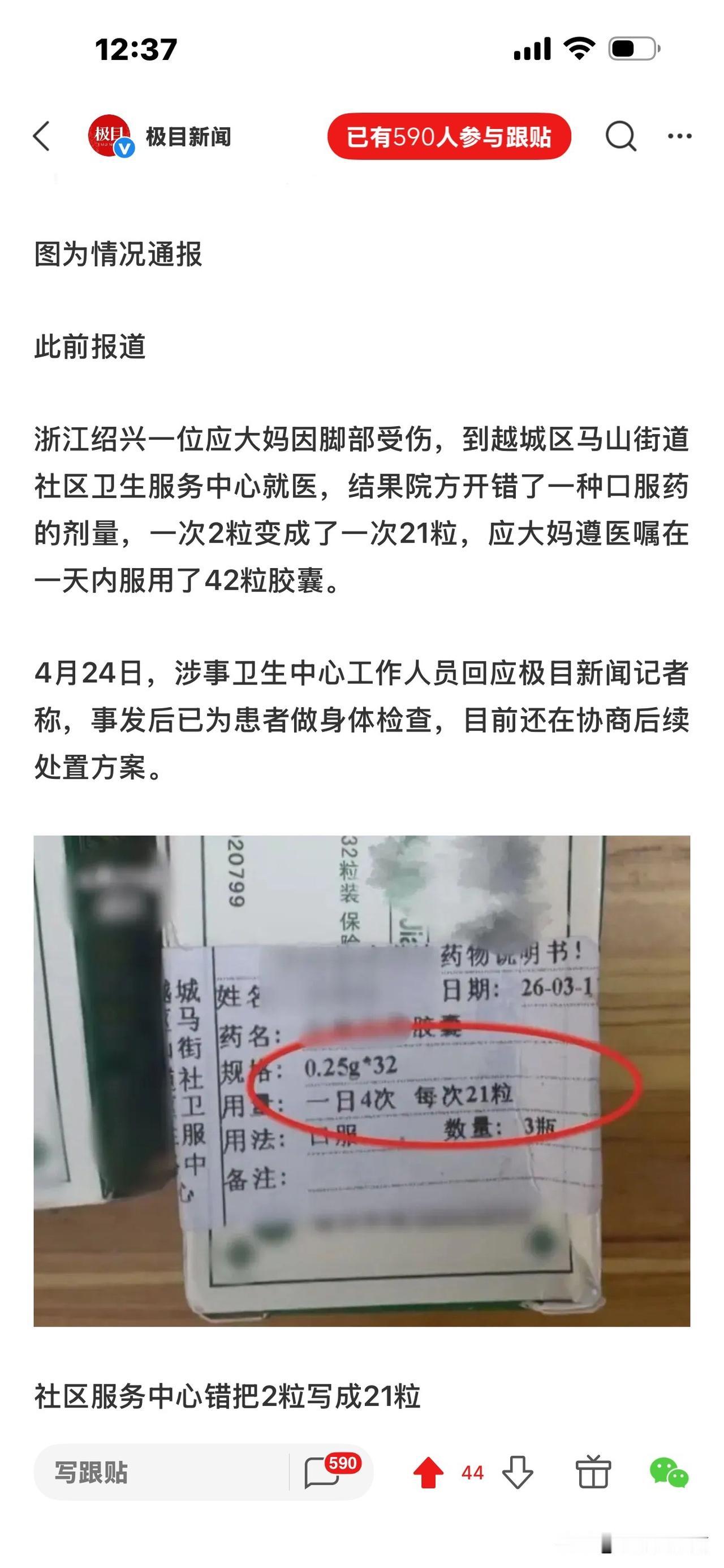 市区卫生服务中心开错药,2粒写成21粒, 大妈一天吞服42粒, 恶心心慌,差点挂掉! 今年3月,浙江绍兴一位大妈骑电动车扭伤了脚,去马山街道社区服务中心就诊。 医生给大妈开了一种口服的中成药胶囊,用药量是一天4次,一次2粒。 结果医生操作失误,在电脑上打出了一次21粒,而药剂师也没有一点怀疑,只是按医生的剂量,说遵照医嘱,给大妈开了整整3瓶胶囊。 大妈也有点糊涂,没有怀疑什么。 回家以后,她按照药包上面医生写的用药说明,一次吞服了21粒,当天她吃了两次,也就是一共吃了42粒。 随后大妈出现心慌心悸,恶心想吐,很不舒服的状况,她告知妹妹,妹妹赶紧叫她赶快停掉,不能再吃了,否则会出大问题。 后来家人查看胶囊药品说明书,才知道用药量是一次两粒,医生开错剂量了。 本来这种药一天吃4次,一次2粒,最多也就是吃8粒,结果大妈一天吃了42粒,可想而知,这是药物严重过量啊。 大妈知道后忐忑不安,心理负担很重。 第二天大妈整个人轻飘飘的,像浮在云上一样,她极度口渴,头晕眼花。 家人也焦虑极了,生怕她出问题,甚至性命堪忧。 家人带大妈到社区医院,经检查,她的多项身体指标超标,出现异常。 大妈的不适症状持续出现了一周左右,所幸的是,现在有所好转,可以上班了。 大妈家属对社区服务中心提出赔偿10万元,毕竟药物过量对身体的损害有时候是隐匿的,要通过长时间才能观察出来,但对方只愿意付给他们2000块。 最新情况是,社区卫生服务中心发了情况通报,目前双方协商一致,医院已经取得了患者的谅解。 真是让人心惊胆战的事件啊,好在大妈没出什么大事。 网友们说,所幸是中成药,如果是西药的话,吃这么多一定会丧命的。 大家家里如果有老人用药,不光要看医生开的剂量,还要帮他们仔细看清楚药品说明书上的用量,两相参照,如果差距很大,就要怀疑,多问一下医生。 [祈祷][祈祷]