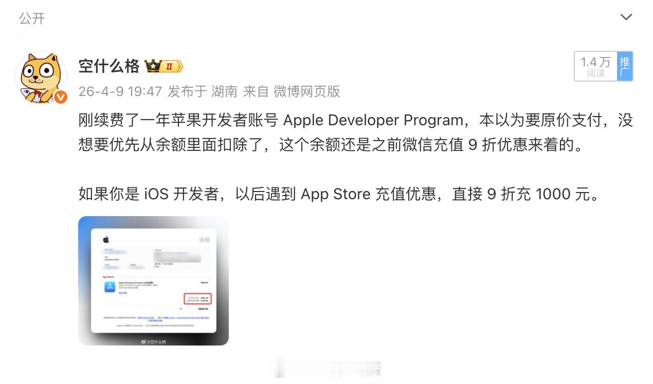 需要特别强调的是,如果你是苹果软件开发者,需要每年续费 688 元的开发者账号,我本人亲测这个充值的余额可以直接抵扣开发者账号的续费。