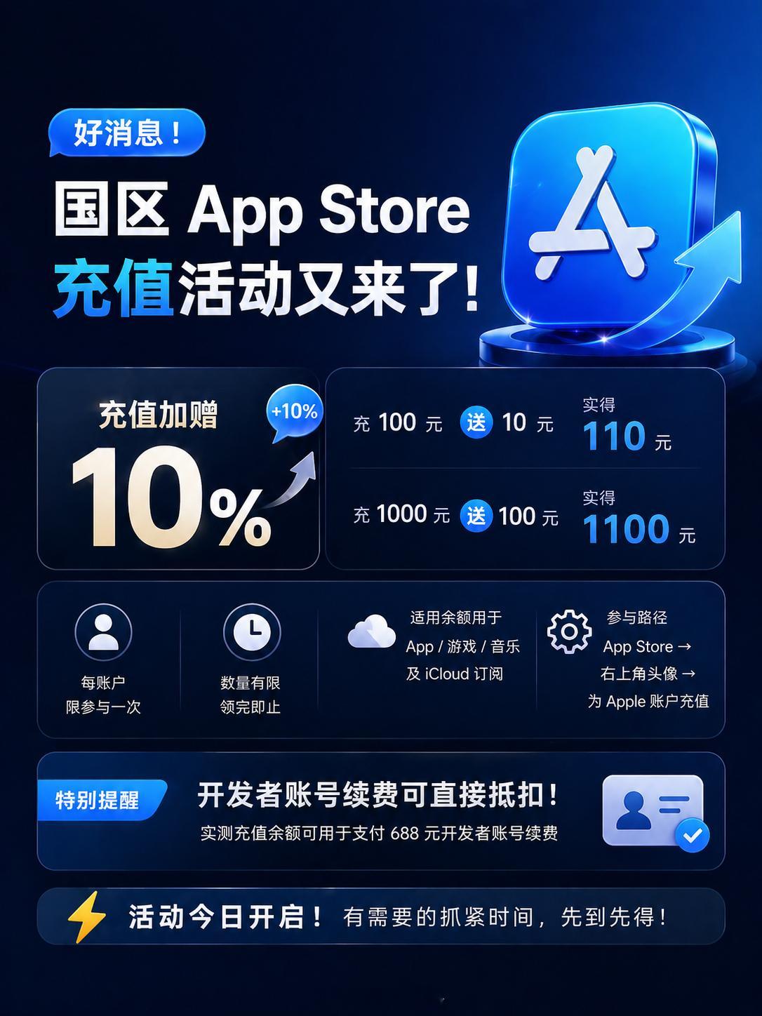 好消息:国区 App Store 充值活动又来了,这次依旧是加赠 10%。比如充值 100 送 10 元实得 110 元,最高充值 1000 实得 1100 元。