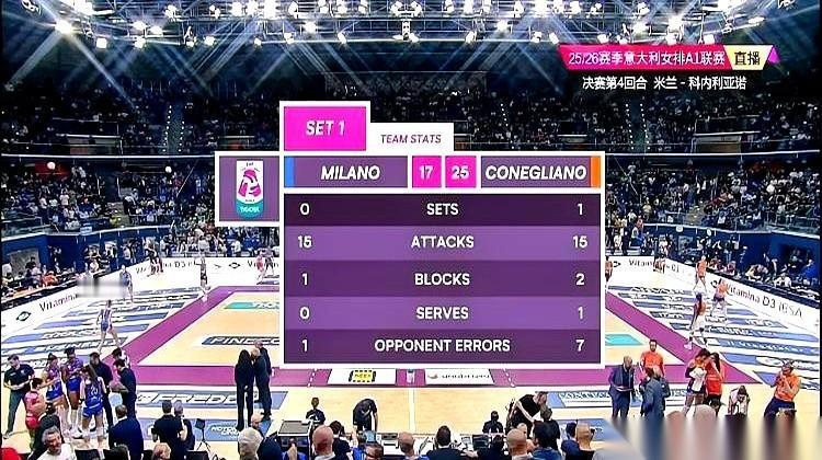 意甲女排决赛第四场,米兰几乎是被按在地上打。 一整局,7次失误,球不是飞出界,就是直愣愣地挂在网上,等于亲手把分塞到科内利亚诺怀里。 反观科内利亚诺,主场气势完全打出来了。球砸在地板上砰砰响,怎么扣怎么有,跟上一场判若两队。全队送给对手的唯一一分,竟然只是哈克一次发球失手,球轻轻飘了出去。 25比17,第一局就这么没了。 还没等米兰喘口气,第二局又被拉开到15比10。队员们你看看我,我看看你,脸上的汗都来不及擦。 这就是主场,不光是山呼海啸的加油声,更是能直接压垮对手心理的那股劲儿。