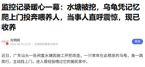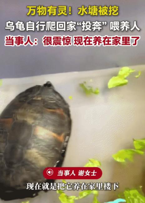 “万物有灵!”广东汕头,乌龟生活的水塘被挖。没想到,它自行爬回家“投奔”喂养它的人。当事人: 很震惊,现在养在家里了。 广东汕头一户人家的门口,一只乌龟慢悠悠地趴在地上,脑袋微微抬起,眼神朝着屋内望去,身上还沾着泥土和杂草,看得出来,它一路爬来十分不易。当事人开门看到它的瞬间,直接愣住,满心震惊,谁也没想到,这只常年生活在水塘里的乌龟,会在水塘被挖后,自行爬回家投奔自己。 这只乌龟,已经在附近的水塘里生活了好几年,平日里,当事人总会特意去水塘边,给它喂食物,时间久了,乌龟渐渐熟悉了当事人的气息,也习惯了这份投喂,每次当事人出现,它都会主动凑上前,十分温顺。 当事人从来没有想过要把乌龟带回家饲养,只是单纯觉得它可爱,不忍心看着它挨饿,便一直坚持投喂,一来二去,就和这只乌龟建立起了特殊的联结,哪怕不常互动,乌龟也能清晰分辨出当事人的身影和气息。 前段时间,因为周边环境整治,乌龟生活的那口水塘被依法开挖,塘里的水被抽干,周边的泥土也被清理,原本舒适的家园,瞬间变成了一片废墟,再也没有适合乌龟生存的环境。 水塘被挖后,当事人还特意去看过几次,却始终没有找到乌龟的身影,心里难免有些失落,以为乌龟已经顺着周边的河道,迁徙到了其他地方,也渐渐放下了心,没再过多留意。 他万万没有想到,几天后的一个下午,自己下班回家,刚走到家门口,就看到一只熟悉的身影趴在地上,仔细一看,正是那只他经常投喂的乌龟,身上沾满了泥土,四肢还有轻微的磨损,显然是长途爬行留下的痕迹。 乌龟看到当事人开门,没有丝毫胆怯,反而慢慢抬起脑袋,朝着他的方向挪动了几步,动作缓慢却坚定,仿佛在诉说着自己的无助,也像是在寻找一个可以依靠的港湾,模样十分惹人怜爱。 当事人愣在原地,好一会儿才缓过神来,满心都是震惊,他实在不敢相信,这只乌龟竟然能在水塘被挖、无家可归的情况下,凭借着记忆和对自己的信任,一路爬回自己家,这其中的艰难,可想而知。 他小心翼翼地蹲下身,轻轻抚摸着乌龟的背甲,乌龟没有躲闪,反而十分温顺地趴在原地,任由他抚摸,看得出来,它对当事人有着十足的信任,也把这里当成了可以安心停靠的家。 当事人看着这只历经艰辛爬回来的乌龟,心里满是触动,没有丝毫犹豫,便决定把乌龟养在家里,给它准备了干净的容器和充足的食物,悉心照料它的生活,让它能有一个安稳的家。 当事人表示,以后会一直好好照料这只乌龟,给它一个安稳的生活,也会继续善待身边的小动物,他觉得,每一个生命都值得被温柔对待,哪怕是一只不起眼的乌龟,也有着自己的灵性和情感。 水塘被挖,乌龟无家可归,却凭借着记忆和信任,一路爬回喂养人家中,这份暖心的举动,打破了人们对乌龟“冷漠、迟钝”的认知,也让更多人看到了动物的灵性与善良。 没有轰轰烈烈的举动,只有默默的奔赴,这只乌龟用自己的行动,诠释了“万物有灵”的真谛,也让人们明白,善意从来都不会被辜负,哪怕是对一只小动物的温柔,也能收获最真挚的回报。 对此,你们有什么看法,欢迎评论留言~