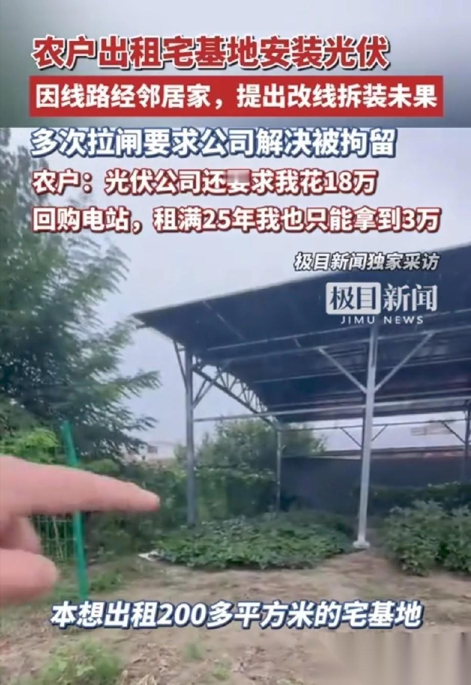 “离大谱!”河北廊坊,男子想着家里的200多平宅基地闲着也是闲着,便把宅基地租给一光伏公司安装了光伏发电站,每年拿一千二的零嘴钱。本以为能捡点小便宜,谁知踩了个大坑。 施工方干活太糙,乱扯线头把邻居给惹毛了。这大哥赶紧找光伏公司理论,人家根本不搭理。人一急眼,干脆把电源给切了,想逼对方出面。 结果呢? 不但蹲了十天班房,还被光伏公司反咬一口,直接索赔将近二十万。 这笔账算得太欺负人了。 整个周期的总报酬算下来也就三万块。现在翻了脸,非逼着农户掏六倍的钱去买断那些设备。 咱们再盘盘断电停机这事儿。 这大哥真是成心搞破坏?热线打不通,售后跑没影,事情全卡死在这儿。普通老百姓碰上这种踢皮球的,除了拔插头让对方也疼一疼,还能有啥招? 这分明是老实人被逼到死角后的无奈自保。 这压根不是啥合同纠纷,就是赤裸裸的围猎。跟早年间下乡免费送净水器、最后强卖天价滤芯是一个套路。 有些企业打着“绿电下乡”的旗号,专门拿捏乡亲们的信息差。前期忽悠得天花乱坠,出了纰漏就当缩头乌龟。一旦农户急眼反击,他们立马掏出格式条款,抡起法务大棒痛下杀手。 吃相太难看。 靠着合同漏洞专门收割底层老百姓,这种流氓做派要是不严惩,以后谁还敢信这些下乡项目?整个行业在基层的信誉,迟早被他们自己砸得稀巴烂。 对此,你怎么看?
