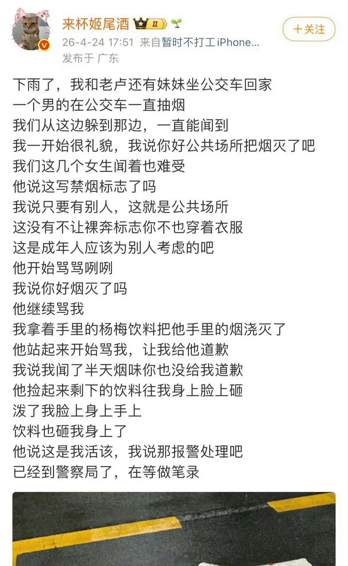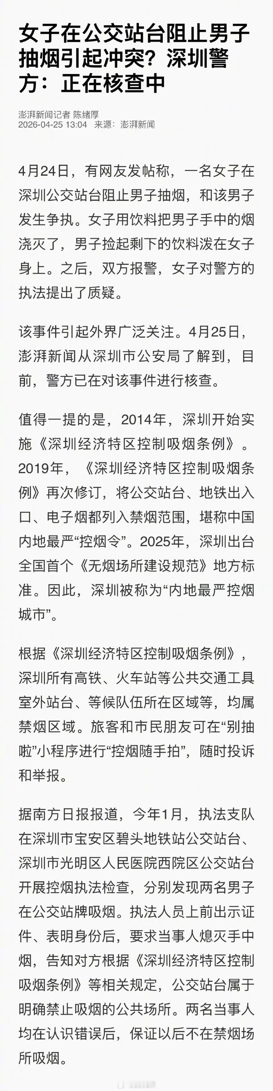 还是老老实实等官方通告吧,现在各类小作文反转的概率实在太高了。核心问题其实是公共场所禁烟执法的及时性跟不上,真等执法人员赶到现场,当事人早就离开,矛盾也没法当场制止警方回应女子公交站阻止男子抽烟引冲突路人无权强行阻止他人公共场所吸烟