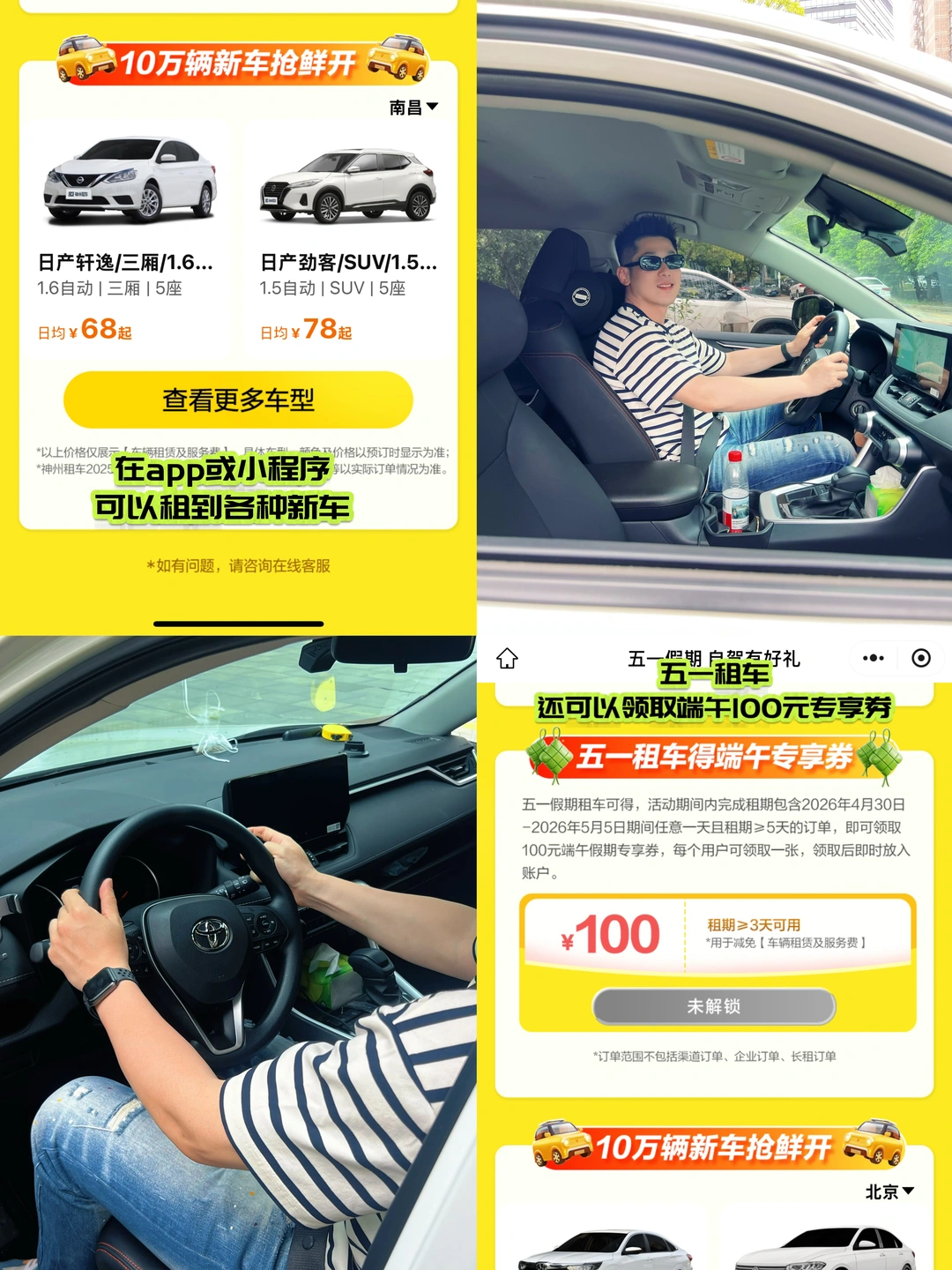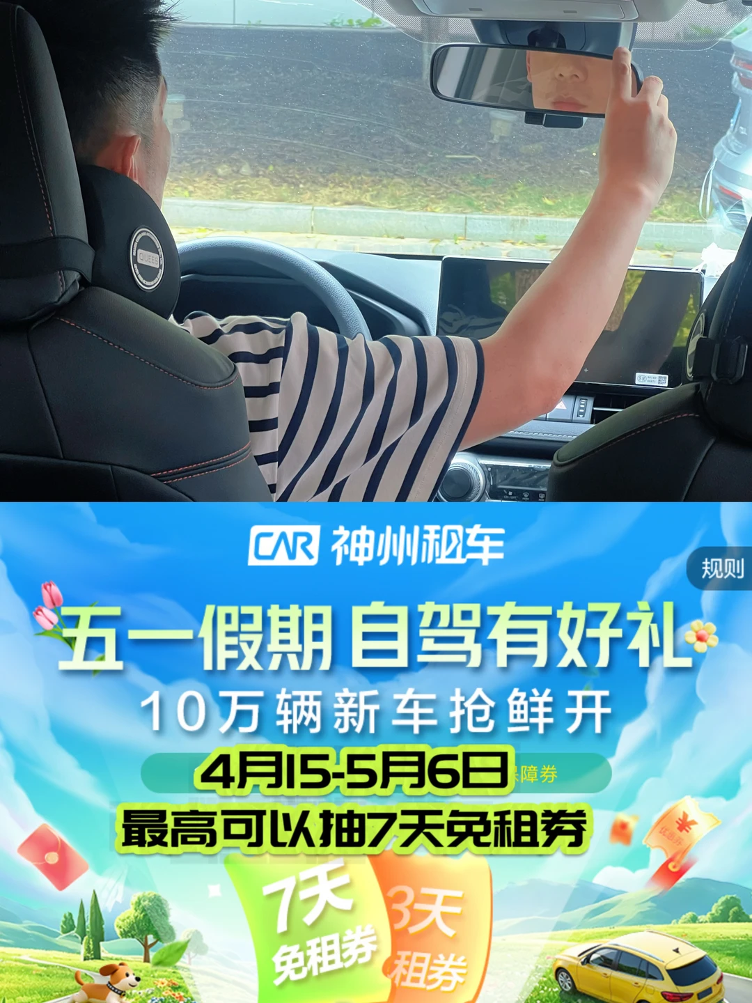 2️⃣ 我们这次是临时起意,直接在「神州租车」小程序上订的车,取还车也方便。如果你五一假期也想来玩,建议提前订车,有机会抽7天免租券哦(具体的假期活动可以上小程序看看)