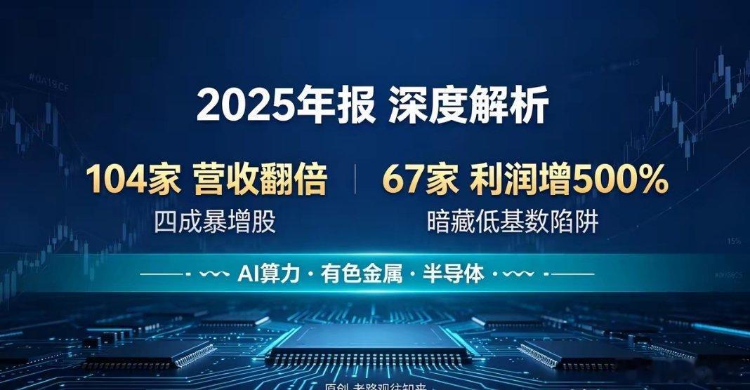 总览篇——104家营收翻倍,67家利润暴增500%2025年年报成绩单出炉!3766家公司已交卷,这些数字太炸裂——截至4月25日,A股已有3766家披露2025年报,披露率68.44%。老路连夜扒完数据,几个关键数字先划重点:🔥 104家公司营收同比翻倍(占比仅2.76%)🔥 67家公司利润增长超500%(占比1.78%)🔥 25家利润增幅超1000%,堪称“大增天团”三大赛道贡献了七成高增长股:· AI算力/半导体:量价齐升,增长质量最高· 有色金属/化工:涨价驱动+低基数共振· 电力设备/新能源:反转进行时,但分化明显但老路必须提醒:约四成大增股,靠低基数充数,去年赚几十万,今年赚几百万就增长几十倍,绝对值并不大!