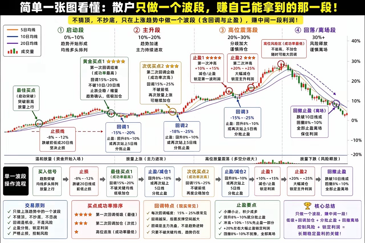【一张图看懂:散户只做一个波段,怎么一步一步赚钱?】很多人做股票最大的问题只有一个:👉 想买最低,卖最高。A股平均一个波段15-25%左右,每次波段能把这都拿到吗,能拿到10%-15%左右已经很厉害?但现实是——你做不到,也不需要做到。---一、先记住核心原则(一定要配合图看)✔ 只做上涨趋势(5/10/20日线向上)✔ 只做一个波段(不恋战)✔ 只赚中间那一段利润👉 下面每一步,都在图中有对应位置---🟢 ① 启动段(图最左:买点)当你看到:- 5日、10日、20日线开始上扬- 股价站上均线👉 操作:✔ 买入30%仓位(试仓)👉 止损:✔ -8%~-12% 或跌破20日线👉 重点:这里只是上车,不是重仓点---🟡 ② 第一次回调(图中“黄金买点1 ⭐⭐⭐⭐”)👉 整张图最重要的位置!当你看到:- 回调15%~20%- 不破10/20日线- 出现止跌👉 操作:✔ 加仓到60%~70%👉 重点:成功率最高的买点(一定要找这个位置)---🔵 ③ 第一次冲高(图中“止盈1 +10%~15%”)👉 操作:✔ 卖出30%~50%👉 重点:先把最容易赚的钱拿走---🟡 ④ 第二次回调(图中“次优买点2 ⭐⭐⭐”)👉 条件:- 回调15%~25%- 不破前低👉 操作:✔ 小幅加仓👉 重点:还能赚,但风险开始变大---🔵 ⑤ 第二次冲高(图中“止盈2 +20%~25%”)👉 操作:✔ 再卖30%~50%👉 重点:锁住主升浪利润---🟠 ⑥ 高位震荡(图中“高位风险区”)👉 操作:❌ 不加仓✔ 只减仓👉 重点:这里看起来最强,其实成功率最低---🔴 ⑦ 回撤止盈(图最右:离场点)👉 条件:- 跌破10日线- 或回撤8%~10%👉 操作:✔ 全部卖出👉 重点:不把利润还给市场---📌 整张图总结👉回调(左侧)→ 加仓冲高(中段)→ 减仓高位(右侧)→ 不参与---🎯 最后一句(一定要记住)👉真正该赚的钱,不是最低和最高,而是趋势中间那一段。(个人观点,不构成投资意见)