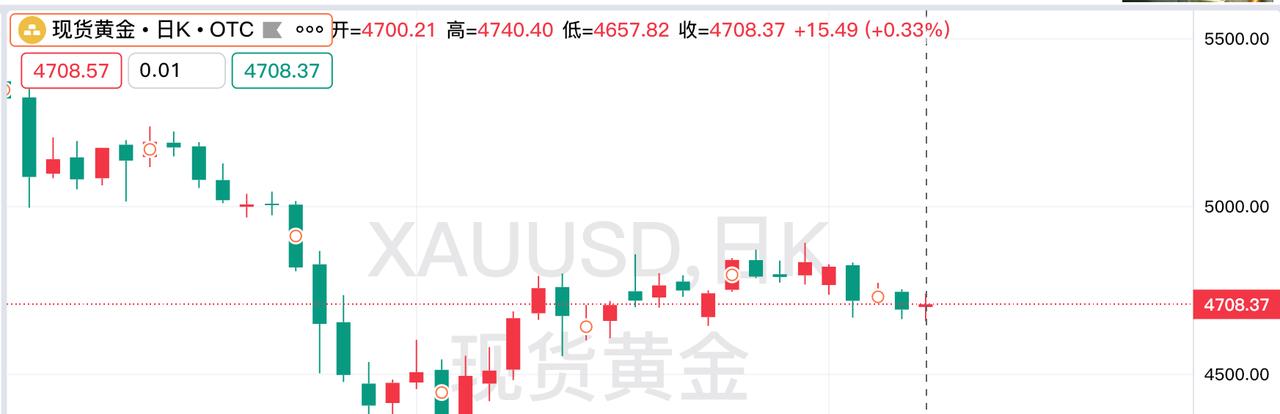周五现货黄金 止跌回升,小幅反弹。 昨日现货黄金开盘4700.21美元, 盘中最高升至4740.4美元, 最低价格为4657.82美元, 最终收盘于4708.37美元, 较上一日上涨15.49美金。 对于现货黄金后市,黄金 期货小褚认为有望继续企稳反弹!!!