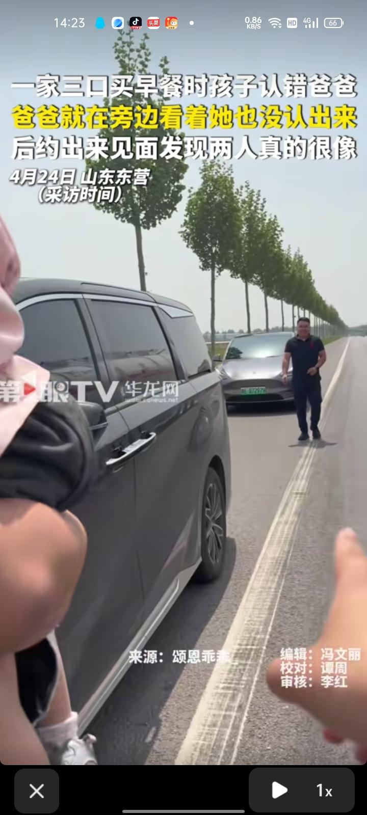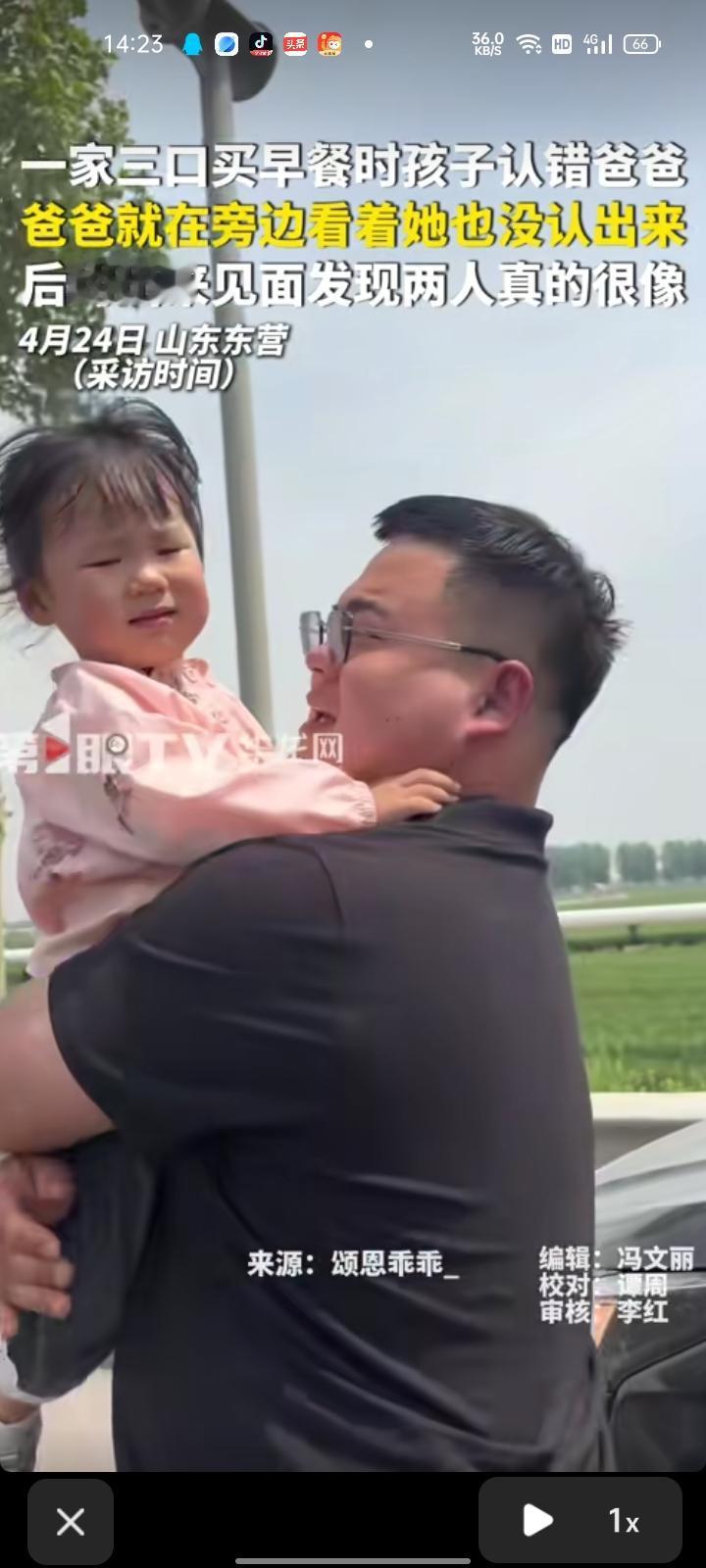 4月24日,东营市广饶县。一家三口买早餐时孩子认错爸爸,爸爸在旁边看着也没认出来,后约出来见面发现两人真的很像。 孩子妈妈宋女士介绍,因为人太多,孩子比较认生,所以看到这么多人,转头就抱抱人家。她以为抱的是他爸爸,没想到抱了一个陌生叔叔,甚至爸爸拿手机拍她,她也不知道。