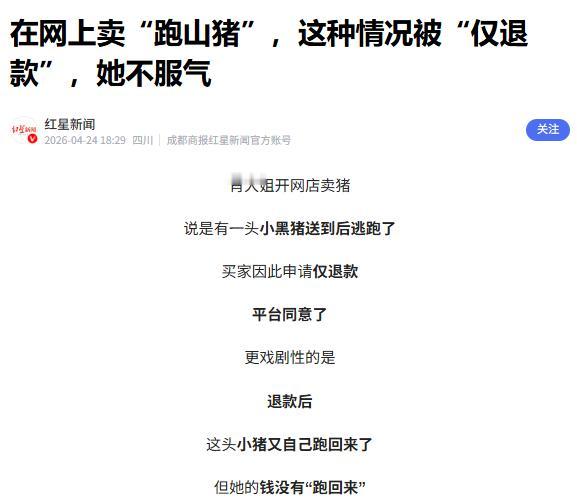 浙江杭州一女子线上卖土黑猪,买家以630元/头的价格下单3头,女子配送后,买家称猪跑了。女子安抚后,猪2天后自行返回。不料一周后,买家又说一头猪越狱,向平台申请退货退款,平台退还630元。随后女子联系买家,得知猪已回来,买家虽答应付款,却迟迟不转钱、不接电话。 浙江杭州,女子在家乡从事土黑猪养殖,近两年线上活体土黑猪交易走红,她便试着在网上开店,专卖自家散养的土黑猪,凭借肉质鲜嫩、原生态养殖的优势,慢慢积累了一些客户,生意还算平稳。 不久前,一位买家通过线上店铺找到她,一番咨询后,以630元每头的价格,一次性下单了3头土黑猪。女子十分重视,当天就挑选了3头健康壮实的土黑猪,仔细打包好,联系配送人员,全程做好防护,确保猪能安全送到买家手中。 配送很顺利,当天下午,买家就确认收到了3头土黑猪,女子悬着的心也落了地,以为这单生意就此圆满结束,没想到,当天晚上,买家就发来消息,说刚收到的土黑猪跑了,跑得飞快,一转眼就没了踪影。 女子看到消息后,没有慌乱,毕竟土黑猪有认路的习性,她结合自己养殖多年的经验,安抚买家,让他不用着急,土黑猪熟悉环境后,大概率会自己找回来,让他多留意自家周边的情况。 买家半信半疑,只能按照女子说的,每天在自家附近巡查,留意土黑猪的踪迹。让人没想到的是,仅仅过了2天,那3头跑丢的土黑猪,竟然真的自己找了回来,乖乖回到了买家的院子里。 女子得知消息后,也松了一口气,以为这件事就此翻篇,可她万万没有想到,平静的日子只维持了一周,买家就又发来消息,说其中一头土黑猪再次“越狱”,这次无论怎么找,都找不到踪影。 没等女子回应,买家就直接向平台提交了退货退款申请,声称土黑猪跑丢,无法正常接收,要求退还其中一头猪的费用630元。平台没有详细核实情况,很快就批准了买家的申请,将630元退给了对方。 女子收到平台的退款通知时,彻底懵了,她赶紧联系买家,询问猪的下落,可买家却迟迟不回复消息,电话也不接。女子不死心,反复尝试联系,过了好几天,买家才终于接了电话。 电话里,买家语气平淡地告知女子,那头所谓“越狱”的土黑猪,其实已经自己回来了,只是他没及时告知。女子当即要求买家支付那630元的猪钱,买家在电话里满口答应,说过几天就转过来。 可女子左等右等,始终没等到买家转来的钱,再次拨打买家电话时,要么无人接听,要么直接被挂断,发消息也石沉大海,彻底没了回音。女子越想越气,自己没做错任何事,却要承担这笔无妄损失。 女子坦言,自己开店以来,一直诚信经营,从未出现过缺斤短两、以次充好的情况,这次遇到这样的买家,真是又无奈又气愤。她还透露,线上卖活体土黑猪,本身就有一定风险,配送、养护都需要格外用心。 女子也曾联系平台客服,说明情况,要求平台介入,让买家支付相应款项,可平台表示,退款已经完成,无法轻易撤销,只能协助联系买家协商,可协商至今,仍没有任何进展。 她回忆,当时配送土黑猪时,特意叮嘱过买家,土黑猪天性好动,喜欢乱跑,一定要做好围栏防护,妥善看管,避免出现跑丢的情况,可买家显然没有放在心上,才会接连出现猪跑丢的情况。 如今,女子依旧在尝试联系买家,希望对方能履行承诺,支付630元的猪钱,可对方始终避而不见。她也只能暂时搁置此事,一边继续经营店铺,一边等待平台的协商结果。 女子的遭遇,也给很多线上活体商家提了个醒,交易时一定要留存好相关证据,明确双方的责任,避免出现类似的纠纷。一头土黑猪,一场退款闹剧,背后藏着的是诚信缺失的问题。 对此,你们有什么看法,欢迎评论留言~
