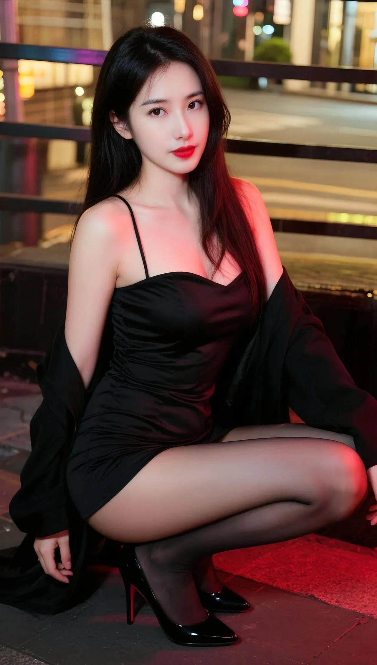 夜晚街头的迷人红唇,黑色连衣裙与高跟鞋的完美搭配,尽显优雅与神秘。
