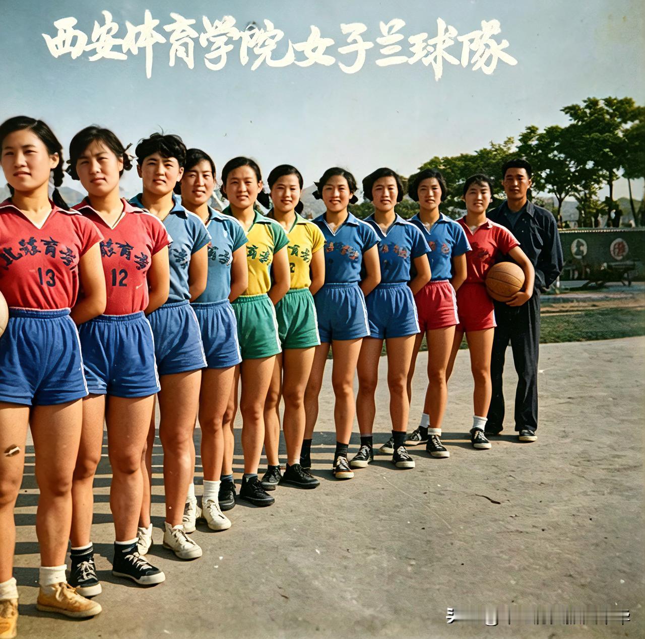 1957年,西安体育学院女子篮球队的合影。 照片标题中“篮球”写作“兰球”,这并不是错别字,而是当时汉字简化和用字习惯的体现,属于上世纪50-60年代的典型写法,具有鲜明的时代特征。 队员们身形健美充满活力,穿着统一的运动短裤、短袖队服,左边两名队员的队服上印有“体育学”字样和编号(如12、13号),还有一位队员手持篮球,不明白的是他们衣服上印的不是“西安体育学院”。最右侧的一名男性应该是教练,他怎么穿的是便装而不是训练服呢? 那时候的训练场地都是在露天球场,没有今天的豪华室内训练场,展现了新中国成立初期体育院校队员们艰苦朴素的训练场景。牢记历史爱我中华
