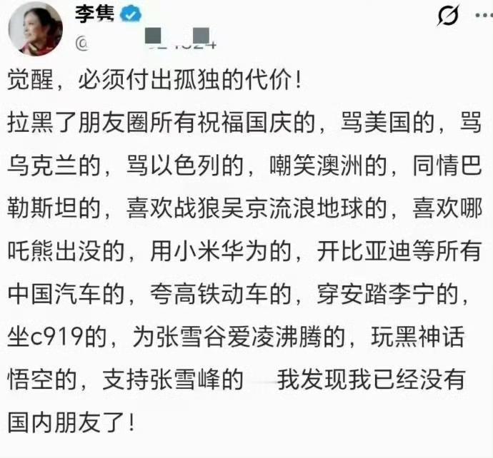 李隽,早年公费出国去澳大利亚留学,滞留未归。如今要拉黑朋友圈里所有与中国有关的人,包括她的家人。她的帖子就不重复了,网友们可以自己看,此人真的是疯了。她亲美可以理解,美国是她的精神祖国。以色列和乌克兰与她有什么关系?