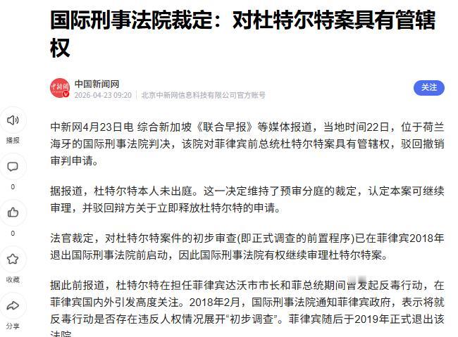 菲律宾这次是真的硬气起来了,菲律宾国内直接炸了锅。 4月22日,国际刑事法院上诉法庭作出裁决,确认对杜特尔特案拥有管辖权,同时驳回了辩方要求立即释放他的申请,据新华社4月23日报道,法院给出的理由是相关行为发生在菲律宾仍是成员国期间,且检方在菲律宾退出前就已启动调查程序。 国际刑事法院的法官们这次可没含糊,直接把“管辖权”的问题说死了,他们说,杜特尔特被指控的“反人类罪”,这些行径均发生于2019年菲律宾退出《罗马规约》之前。 尤为关键的是,检方早在2018年就已开启调查,那时菲律宾仍未退出该规约。 意思就是,国际刑事法院的管辖权看的是“你干坏事的时候是不是会员”,不是“现在是不是会员”,这一解释,直接把杜特尔特团队的“菲律宾已退会,你们没资格管”的借口给堵死了。 判决一出来,菲律宾国内立马分成了两拨人,杜特尔特的女儿莎拉第一个跳出来反对,她号召支持者别怂,还说“菲律宾的主权不能被踩在脚下”。 莎拉这么一说,杜特尔特的老根据地棉兰老岛那边,马上就有小规模抗议,有人举着“还杜特尔特自由”的牌子游行。 可现任总统马科斯的姐姐伊梅却公开唱反调,马科斯家族和杜特尔特家族本来就不对付,现在国际刑事法院插一脚,正好给了马科斯打压对手的机会,所以有人私下说:“伊梅这是嘴上说失望,心里乐开了花吧?” 最让人关注的还是杜特尔特本人,这老头今年81岁了,身体本来就不好,被关在海牙拘留中心后,状态更差了,第一次视频出庭时,他坐在椅子上,眼神迷离,说话也结结巴巴的,看着特别可怜。 他的律师团队赶紧找借口,说“老头精神不好,不能出庭”,法院倒是通融了,允许他不用参加2月的听证会,但以后审判要是强制他到场,这老头能不能扛住,谁也说不准。 说实话,这判决看着像法律问题,其实全是政治账,国际刑事法院为啥选这时候判?还不是因为现在菲律宾新政府和杜特尔特家族斗得厉害,法院想借机刷存在感,证明自己“还能管事”。 毕竟最近几年,美国制裁国际刑事法院的法官,好多国家都退会了,法院急得直跳脚,正需要杜特尔特这种“大案子”来证明自己。 但这么做风险也大,菲律宾是主权国家,自己的事儿自己管,你国际刑事法院跑来插一脚,不是激化矛盾吗?以后别的国家要是也怕被“管”,干脆都退会,那国际刑事法院还怎么玩? 对杜特尔特来说,这审判结果可能已经不重要了,他当总统时风光无限,现在却成了“阶下囚”,政治遗产算是毁了,而菲律宾也得好好想想:在主权和国际义务之间,到底该怎么选?是硬气到底,还是妥协求和?这场戏才刚刚开始!