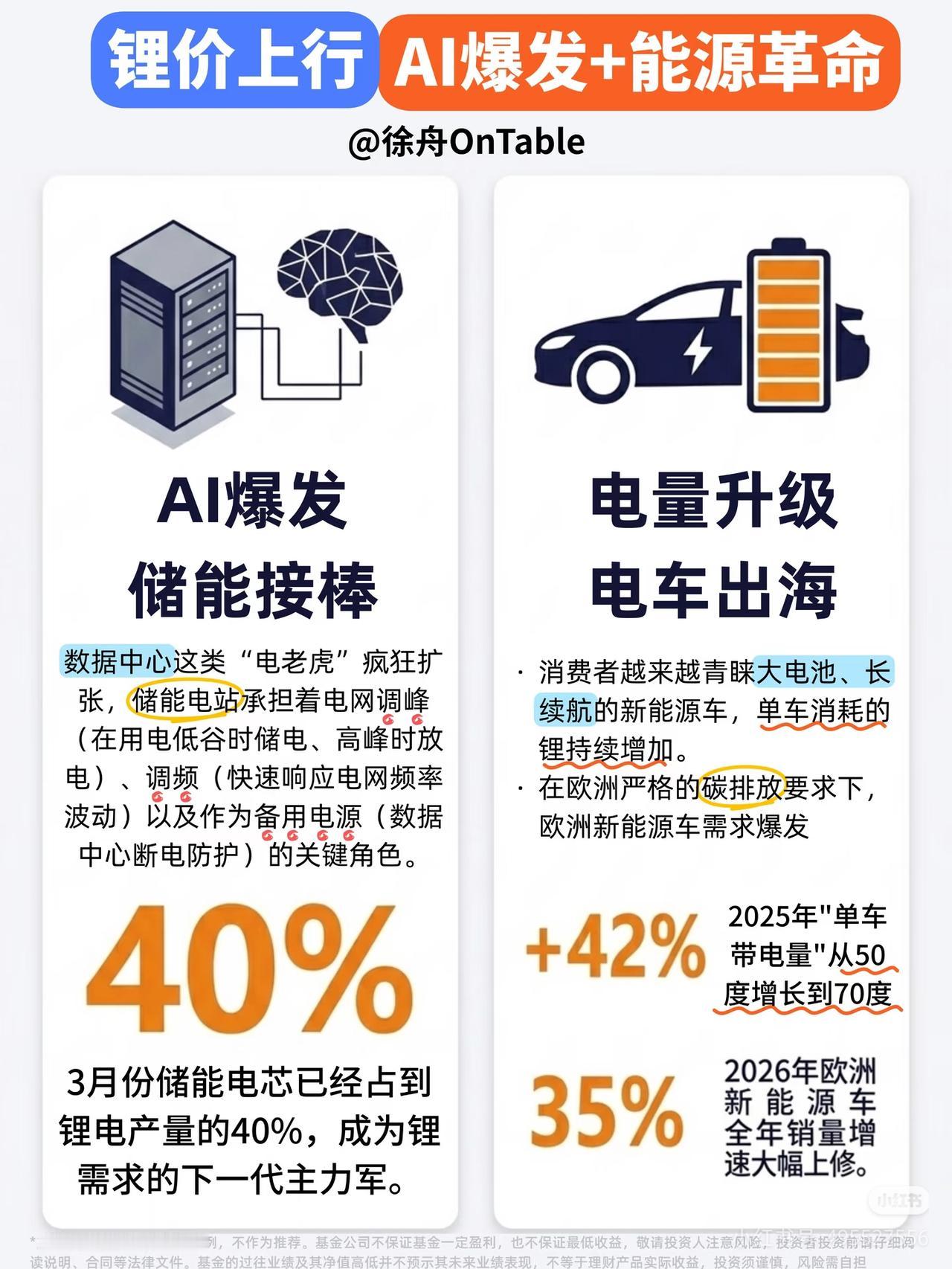 锂价疯涨!普通人怎么抓住“白色石油”的财富机会? 家人们!最近锂价的疯涨,你们刷到了吗? 从去年四季度开始,锂价直接从7万一吨飙到了17万一吨,相关的锂矿企业、基金也跟着起飞,华夏核心成长这类产品一年涨了近70%!很多人都懵了:不就是个金属吗,怎么就成了新时代的“白色石油”?今天就用大白话给你们扒明白! 先给没搞懂的朋友补个课:为啥锂能当电池的“主角”? 就俩字:能打! 锂这玩意儿又轻,能量密度又高,同样重量的电池,它的储电量是传统电池的3到5倍! 而且别看它叫“稀有金属”,其实储量不算少,但产地太集中了,南美锂三角、澳洲、非洲津巴布韦,这几个地方一“打喷嚏”,全球锂价就得“感冒”。 它的用处更是刚需:手机电脑、新能源车、电网储能,现在咱们生活根本离不了它! 这次锂价疯涨,说白了就是四个字:供需失衡! 一、供给端直接“断粮”,恐慌拉满 1. 津巴布韦直接停了锂矿出口!人家可是全球第4大锂矿生产国,一下就切掉了全球10%的供给,就算后面恢复,审批也慢得要死,市场直接慌了。 2. 澳洲也出问题了!地缘冲突把原油通道断了,澳洲采矿运货全靠柴油,库存又低,直接减产!要知道澳洲可是占了全球30%的碳酸锂产量啊! 二、需求端直接爆了,抢都抢不过来 1. AI和储能直接接棒!数据中心这个“电老虎”疯狂扩张,储能电站得给电网调峰、给数据中心当备用电源,今年3月储能电芯已经占了锂电产量的40%,成了锂需求的主力军! 2. 新能源车也在疯狂“吃锂”!现在大家买车都要大电池、长续航,单车带电量从50度涨到了70度,直接涨了42%!再加上欧洲碳排放卡得严,新能源车需求直接爆发,今年销量增速大幅上修! 一边是供给砍了一大块,一边是需求直接翻倍,锂价不涨才怪! 很多人问:这波行情普通人能蹭上吗? 别乱买矿股!普通投资者更稳妥的方式,就是关注相关的指数基金或者主题基金,就像图里提到的华夏核心成长这类,跟着行业吃红利。 但最后必须提醒一句:投资有风险,入场需谨慎,别看着涨就all in,留好自己的子弹! 你们觉得这波锂价能涨到多少?评论区聊聊你的看法! 锂价 新能源 投资 普通人理财