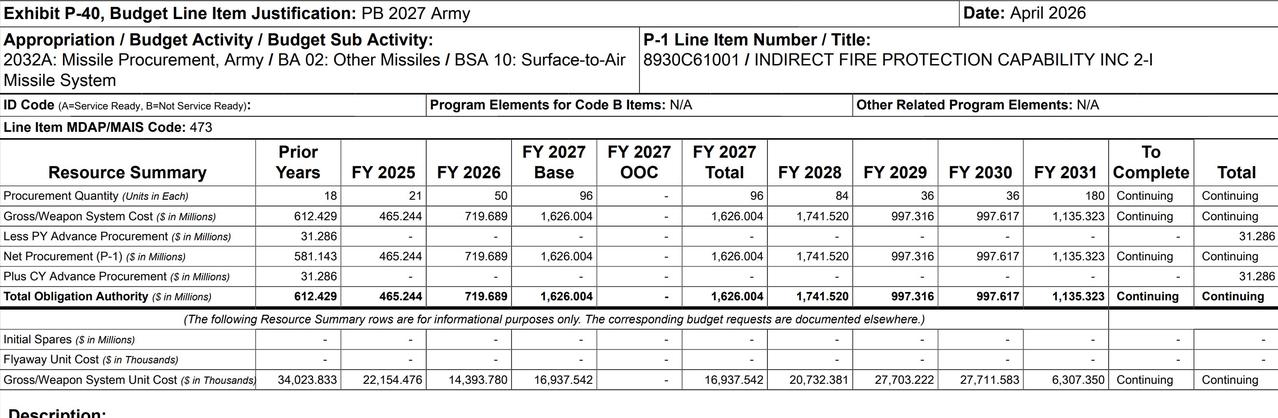 美国陆军正在寻求为其间接火力防护能力增量2(IFPC Inc 2),采购计划在2027财年获得大幅增加,因为该武器系统正过渡到全速率生产的快速部署阶段。美国陆军的2027财年预算包括为96个IFPC Inc 2发射器、504枚AIM-9X拦截弹以及84个IFPC弹药箱连同其他支持硬件提供资金。陆军的2027财年预算请求采购34部Sentinel A4雷达。AIM-9X是陆军暂时的IFPC Inc. 2拦截解决方案,因为该军种正在开发并采购目前处于竞争中的新型2型“持久”拦截弹。 美国陆军计划在2030财年(采购年)之前订购超过300套IFPC增量2型发射器,以快速重建其近程防空部队结构。IFPC增量2是一种与陆军IAMD-BCS(IBCS)有机兼容的武器系统,能够无缝融入AIAMD升级的爱国者或SHORAD营。重点针对亚音速巡航导弹和UAS的击败,其威胁集将随着2030年左右引入的2型导弹而扩展至超音速巡航导弹和大口径火箭。