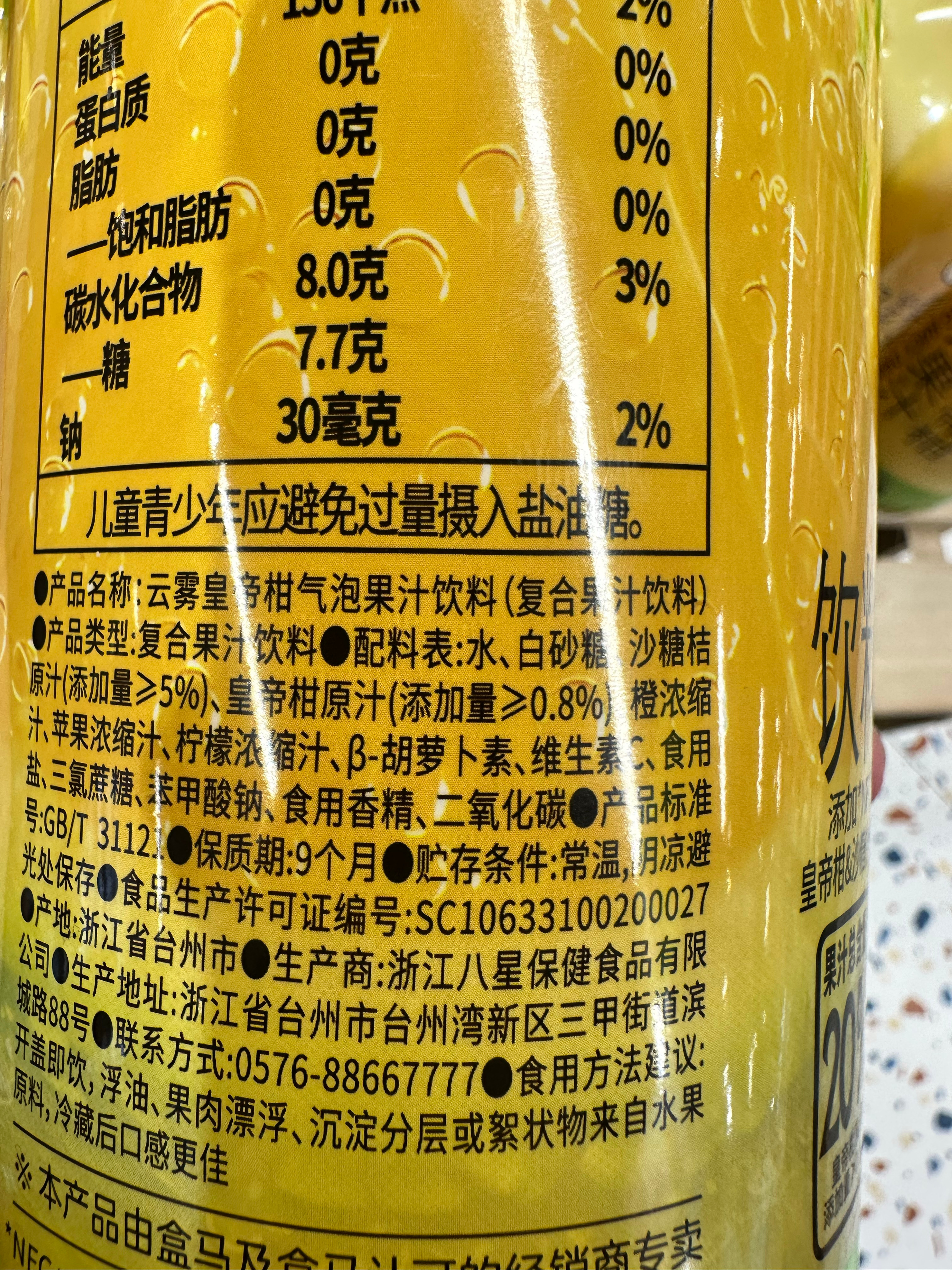 买果汁一定要看后面有没有小字“饮料”,带饮料的一律都不是果汁,而是果味饮料,比如这个皇帝柑气泡果汁饮料,其皇帝柑原汁添加量是≥0.8%。 饮料的本质是小糖水+香精,加一丢丢果汁提供情绪价值。