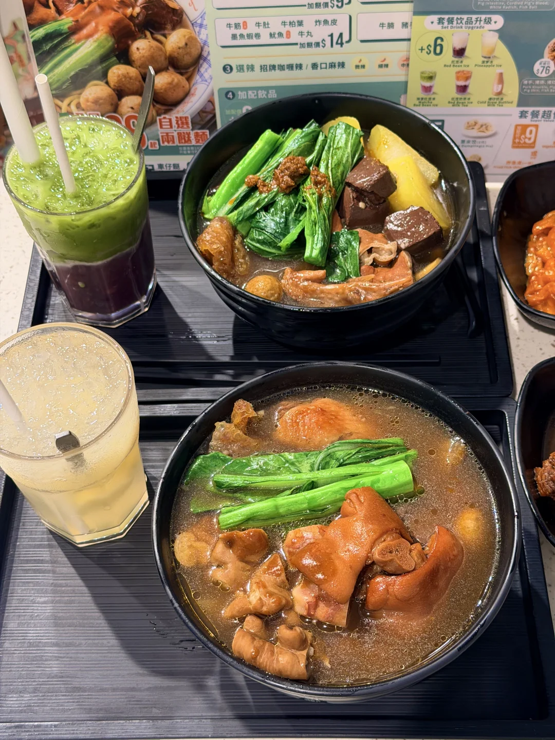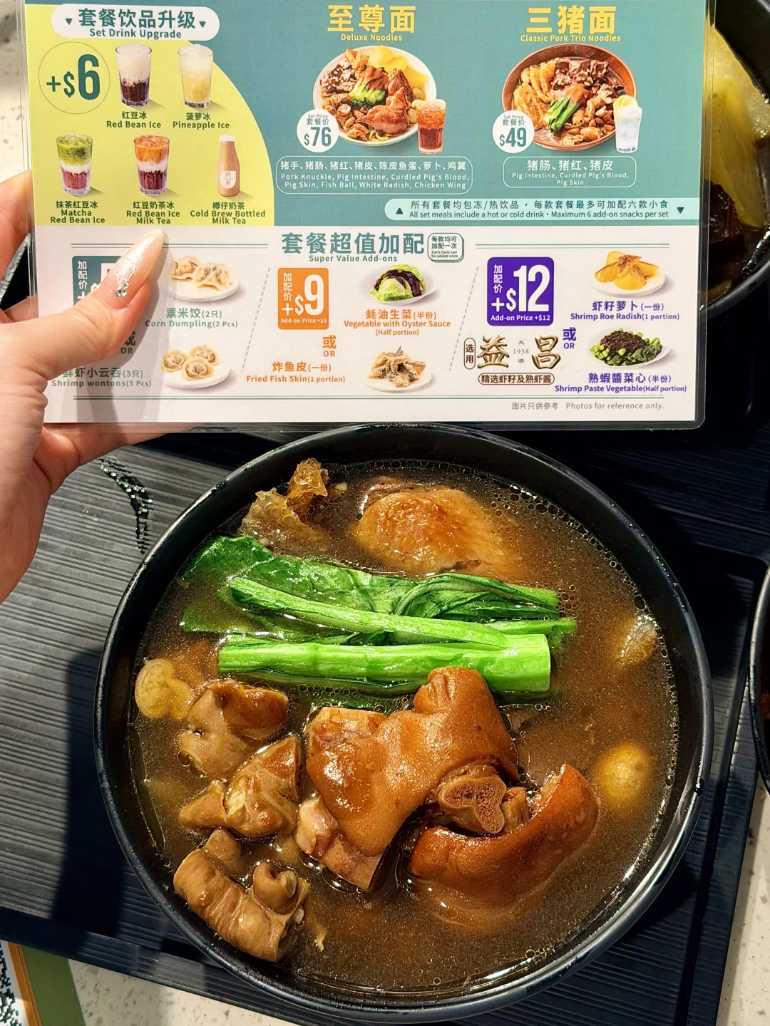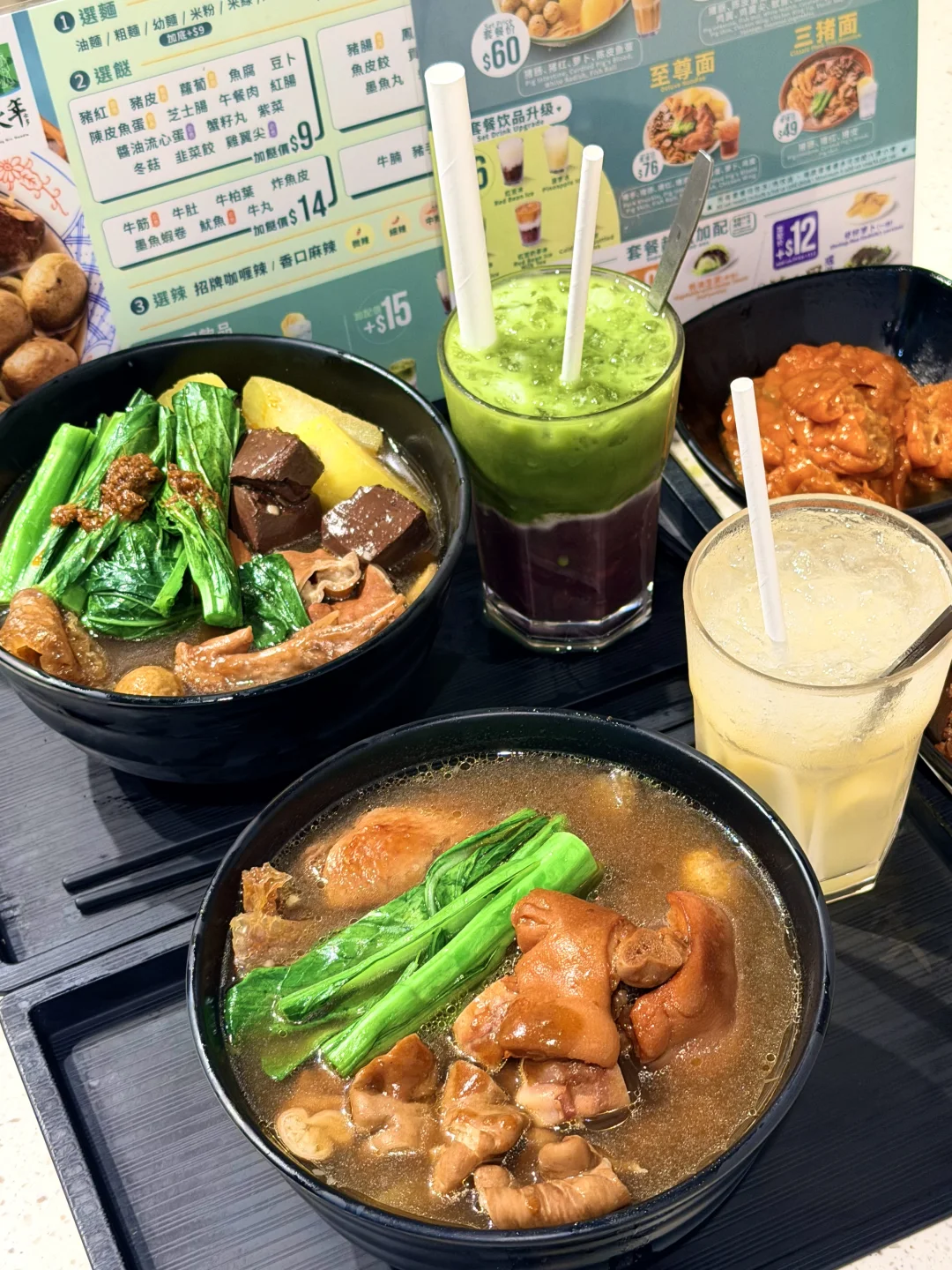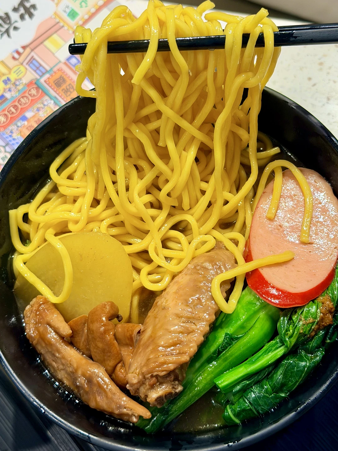 至尊面更是豪华顶配:猪手、猪肠、陈皮鱼蛋、萝卜、猪红、猪皮、鸡翼全都有,口感更厚重满足,想吃得丰盛就选它,一口解锁港式车仔面的精髓。[飞吻R][飞吻R]