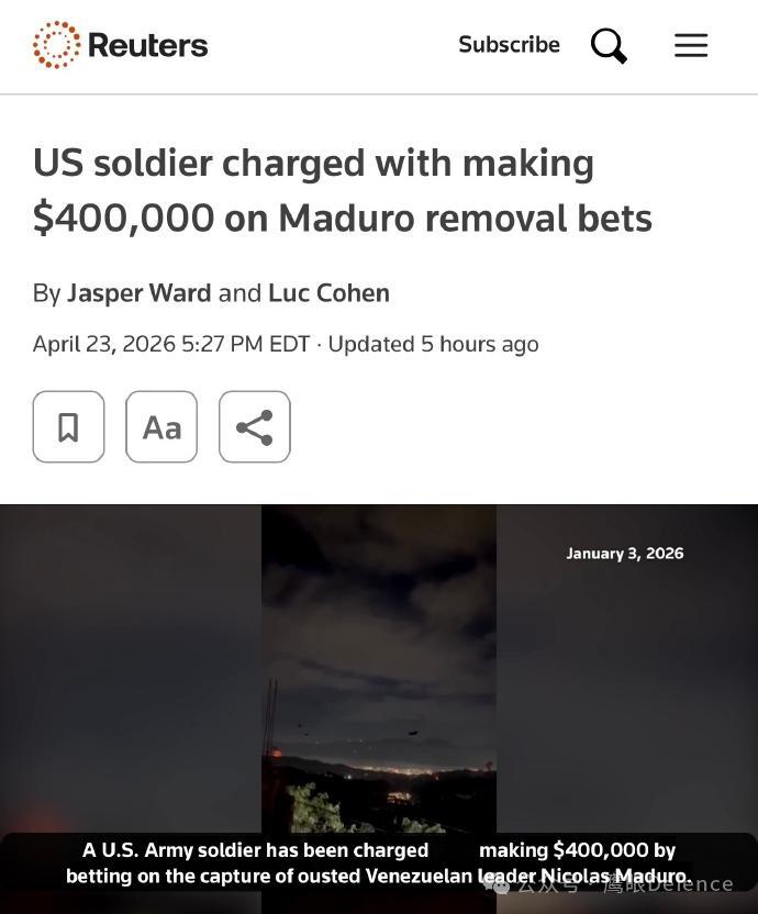 烽火问鼎计划 当地时间23日,美国司法部逮捕了一名陆军特种部队士兵甘农·肯·范戴克,他在美军特种部队于1月3日抓捕马杜罗夫妇之前,也就是1月2日,利用内部信息在Polymarket下注3.3万美元,获利超过40.9万美元,涉嫌违反《商品交易法》的3项指控、1项电汇欺诈指控和1项非法货币交易指控,面临最高60年监禁。