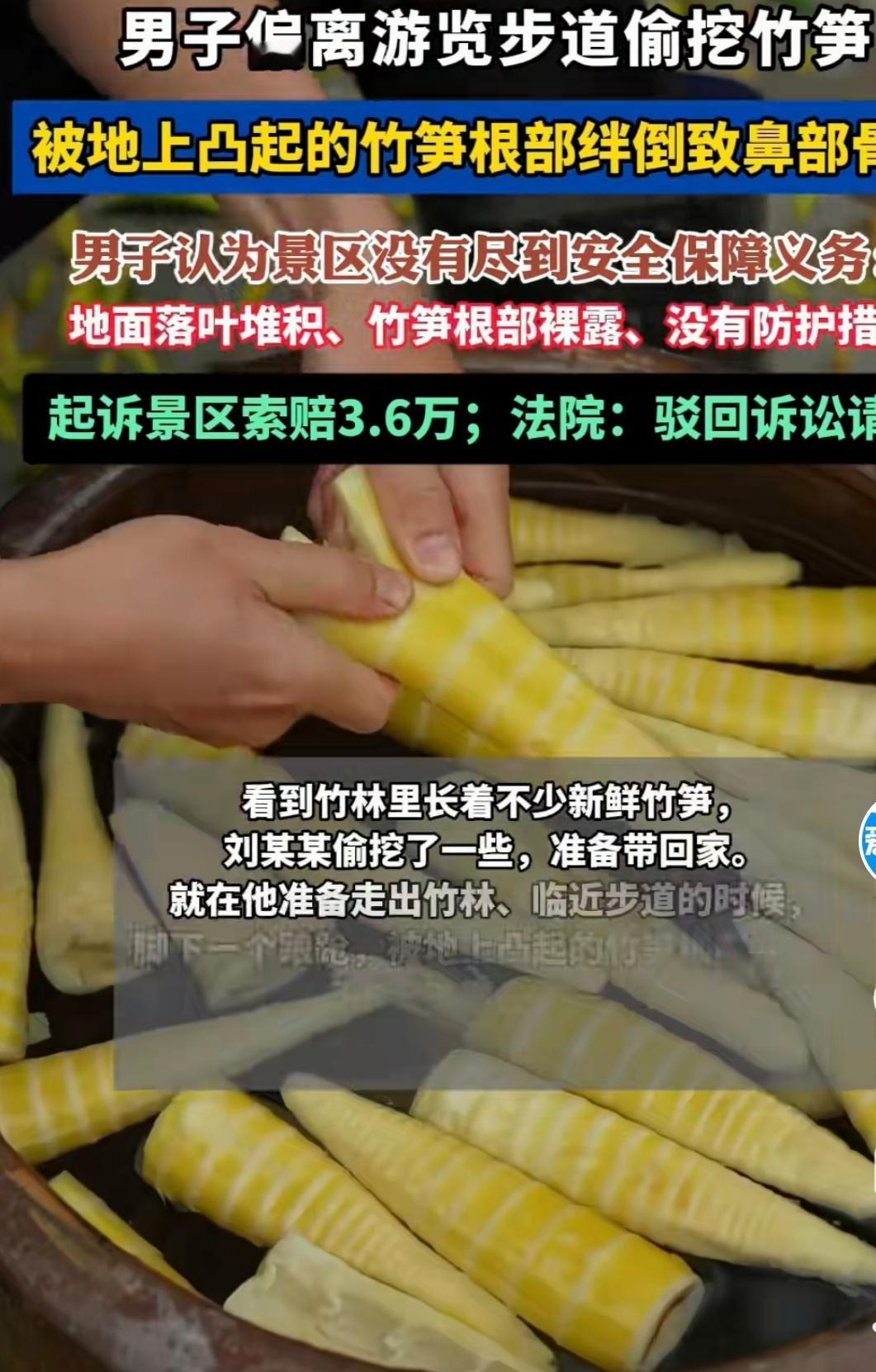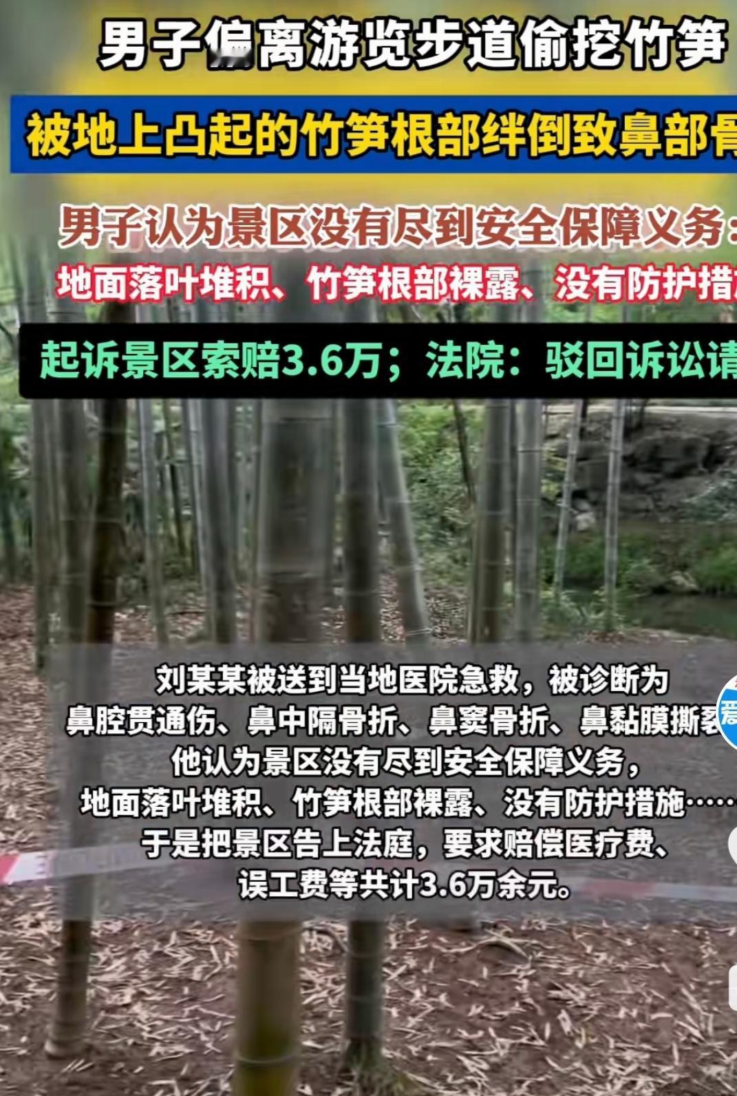 重庆,一男子带着家人去景区游玩,门票每人25元,游玩途中男子想上卫生间,环顾四周没有找到,他就偏离了游步道向傍边的竹林进去方便一下,结果看见竹林里有很多新鲜的竹笋,他偷偷地挖了很多,准备带回家,没有想到在走出竹林的时候,被一根竹笋摆到,整个人摔下去,造成鼻梁骨折,他认为这是景区没有尽到安全保障义务,起诉法庭要求赔偿误工费等共计3.6万元,法庭判了。 一个男的带着全家去景区玩,本来是开开心心出门,最后闹到打官司,还成了大伙茶余饭后的笑料。 当天景区人不少,男的中途想上厕所,找了一圈没见着公厕,他没想着问问工作人员,也没找指示牌,直接往游步道旁边的竹林里钻,打算找个隐蔽地方方便。 刚进去没两步,就看见林子里长了不少新鲜竹笋,嫩生生的看着就好,他瞬间动了歪心思,厕所也不上了,蹲下来就开始挖,七七八八挖了一大堆,都装到随身带的袋子里,想着带回家炒着吃正好。 结果挖完笋往出走的时候,他光顾着看手里的“战果”,没注意脚底下,被地上冒出来的一根竹笋直接绊倒,整个人脸朝下摔了个结实,当时鼻子就流血了,疼得站都站不起来。 家人赶紧送他去医院,一查是鼻梁骨折,前前后后治病加上休养,折腾了好长时间,班也没法上。 这男的越想越气,觉得自己摔了全是景区的错:要是景区多设几个厕所,他也不会往竹林里走;要是竹林边上立个牌子说里面有竹笋容易绊倒,他也不会摔。 越想越觉得自己有理,直接把景区告到了法院,要景区赔他医药费、误工费加起来一共3万6。 法院审这个案子的时候也明明白白,首先,景区的游步道和公共区域都有明确的指示牌,卫生间的位置也标得清清楚楚,是他自己为了挖笋故意偏离游步道,跑到未开放的竹林里去,本身就违反了景区的管理规定。 再者,他挖竹笋本身就是偷盗景区财物的行为,自己干错事的时候受了伤,哪有让景区买单的道理? 最后直接驳回了他的全部诉讼请求,一分钱都没让景区赔。 消息传出来,大伙都觉得法院判得太对了。 这男的纯粹是贪心惹的祸,要是他不惦记那点竹笋,老老实实找厕所,根本就不会摔。 自己干了不占理的事,还好意思反过来要赔偿,这不就是耍无赖吗? 真的,到哪都得守规矩,景区不是自己家菜园子,不能想干嘛就干嘛。 别总觉得自己受了伤就有理,法律从来不会惯着不讲理的人。 想占便宜之前先掂掂分量,最后偷鸡不成蚀把米,丢了人还自己承担损失,犯不上。 最后也给所有人提个醒:出门游玩文明为先,不该碰的东西别碰,不该去的地方别去,真要是因为自己不守规矩出了事,哭都没用。 这事就是典型的“偷鸡不成蚀把米,赔了夫人又折兵”,自己动了歪心思吃了亏,反倒想赖别人买单,天底下哪有这样的道理? 首先得说,景区只要把开放区域的安全做到位,把指示牌立明白,就已经尽到责任了。 总不能要求景区把荒郊野岭的每根竹笋都围起来、每个树坑都标上警示吧?真那样的话,别说25块门票,250块都下不来。 再说这男的进竹林本来就不是什么正经事,一开始说找厕所,看见竹笋就忘了自己要干嘛,明摆着就是想偷拿景区的东西,本身就不占理。 现在不少人都有这种“我受伤我有理”的逻辑,不管自己干了啥,只要出事了就先找别人的毛病,总想着能讹一点是一点。 可法律从来不会和稀泥,你自己违反规定跑到未开放区域,还干着偷盗的事,出了风险当然得自己担着。 真要是这种情况都能让景区赔钱,那以后谁还敢办景区?随便有人偷东西摔了都要赔,早就赔倒闭了。 做人不能太贪心,也不能太不讲理。 不是自己的东西别碰,不让去的地方别去,真要是因为自己作妖出了事,就得老老实实自己担着,别总想着甩锅给别人。 《民法典》第1198条规定,经营场所、公共场所的经营者、管理者未尽到安全保障义务,造成他人损害的,应当承担侵权责任;受害人自身存在过错的,可以减轻或免除经营者责任。 本次案件中,男子擅自偏离开放游步道进入未开放区域,且自身存在盗窃景区竹笋的过错,景区已在公共区域设置明确指引,已尽到安全保障义务,因此无需承担赔偿责任,法院判决合理合法。