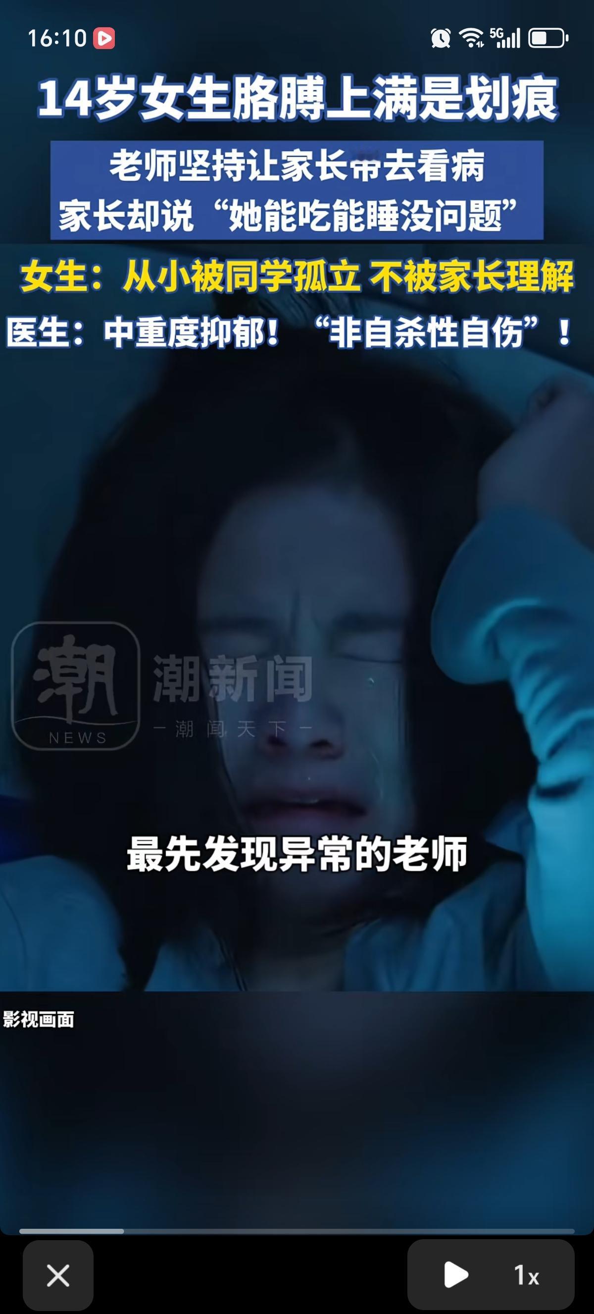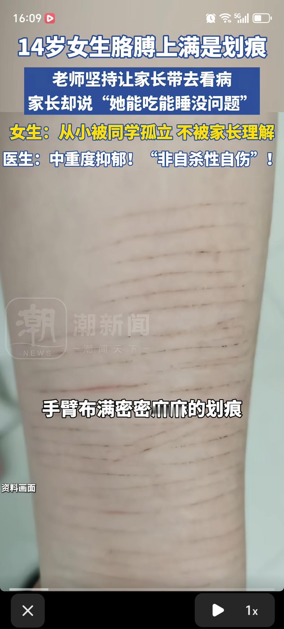 河南郑州一个初中老师发现,自己班上一个小姑娘胳膊上全是密密麻麻的自伤划痕,于是反复跟学生爸妈说一定要带孩子去看看医生。结果她爸妈居然说“孩子能吃能睡,看着没毛病,就是矫情”,根本不当回事。 后来还是孩子自己说出了原因:她从小就被同学孤立,没什么朋友,心里的委屈和痛苦也跟爸妈说不通,没人理解她。她只能用伤害自己的方式,缓解心里的难受。最后去医院一查,医生说是中重度抑郁症,而且是典型的“非自杀性自伤”,不是大家以为的“装样子”。 说白了,就是孩子已经在用最极端的方式喊救命了,家长却还在说“没事”。很多时候,孩子的情绪问题,不是“吃睡正常”就代表没事,自残也从来都不是为了吓唬谁,而是真的撑不住了。真的希望更多家长能多听听孩子的心里话,别等出事了才后悔。