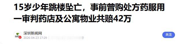 “悲剧还是发生了!”4月23日报道,吉林长春,15岁男孩辍学后,曾在KTV上班,经常在外过夜不回家。一天,男孩在未提供处方的情况下,从药店购买“某某”处方药并服用,之后,他独自进入某公寓楼顶天台跳下坠亡。事后,男孩父母将药店和公寓物业诉至法院,索赔各项损失共计88万余元。法院判了! 吉林长春,男孩辍学后,性格变得越发叛逆,很少回家,经常在外过夜,行踪飘忽不定。父母看着儿子一步步偏离正轨,心里满是焦急,多次劝说、寻找,却始终没能让儿子回头,只能默默牵挂,却无力改变现状。 平日里,男孩很少和父母沟通,凡事都自己做主,情绪也十分不稳定。身边没有家人的陪伴和引导,加上过早接触社会,他的心态渐渐发生变化,偶尔会出现情绪低落、烦躁不安的情况,却无人察觉和疏导。 悲剧发生的那天,男孩独自一人出门,没有告知任何人自己的去向。他辗转来到一家药店,在没有提供任何处方的情况下,顺利购买到了一种处方药,随后便当场服用,没有丝毫犹豫和顾虑。 据悉,近年来青少年药物滥用问题越发突出,尤其是未列管成瘾性物质和处方药的滥用,35岁以下滥用者占比高达86.4%,不少未成年人因缺乏认知,随意购买服用处方药,埋下安全隐患。 服用处方药后,男孩的状态变得异常,眼神恍惚,行动也有些迟缓。他独自一人辗转来到一栋公寓,避开工作人员的注意,悄悄登上了公寓的楼顶天台,没有丝毫留恋,纵身一跃,结束了自己年仅15岁的生命。 直到当天下午,公寓工作人员巡查时,才发现了天台的异常,随后找到了男孩的遗体,连忙拨打相关电话报备。警方赶到现场后,经过初步排查,排除了他杀可能,确认男孩系高空坠亡,现场没有发现打斗痕迹。 男孩坠亡的消息,很快传到了他父母耳中。夫妻俩得知噩耗后,瞬间崩溃大哭,难以接受自己的儿子就这样突然离世,好好的一个人,转眼就阴阳相隔,这份痛苦,让两人几乎晕厥过去。 悲痛过后,男孩父母开始梳理儿子离世的前因后果,他们认为,药店和公寓物业都有不可推卸的责任。药店违规售卖处方药,公寓物业监管不到位,才让悲剧有了发生的可能,于是决定拿起法律武器维权。 男孩父母整理好相关证据,正式将涉事药店和公寓物业诉至法院,明确提出索赔要求,索要死亡赔偿金、丧葬费、精神损害抚慰金等各项损失,共计88万余元,希望能为离世的儿子讨一个说法。 法院受理此案后,依法展开审理,调取了相关监控、证人证言以及药店的销售记录,详细核实了事件的全过程,重点核查了药店售卖处方药的流程,以及公寓物业的安全监管情况,力求做出公正判决。 审理过程中,药店辩称,男孩购买药品时隐瞒了年龄和用途,工作人员疏忽才违规售卖,自身并非故意;公寓物业则表示,已履行基本的安全管理义务,男孩是擅自登上天台,与物业无关。 经过一段时间的审理和研判,法院最终做出判决:药店违规售卖处方药,存在明显过错,承担相应赔偿责任;公寓物业未完全履行安全监管义务,存在一定疏忽,承担次要赔偿责任,双方共计赔偿男孩父母部分损失。 判决结果出来后,男孩父母虽有不甘,却也接受了这个结果。他们失去了唯一的儿子,再多的赔偿,也换不回儿子的生命,这场判决,只是对他们悲痛心情的一丝慰藉,却无法弥补永远的伤痛。 对此,你们有什么看法,欢迎评论留言~