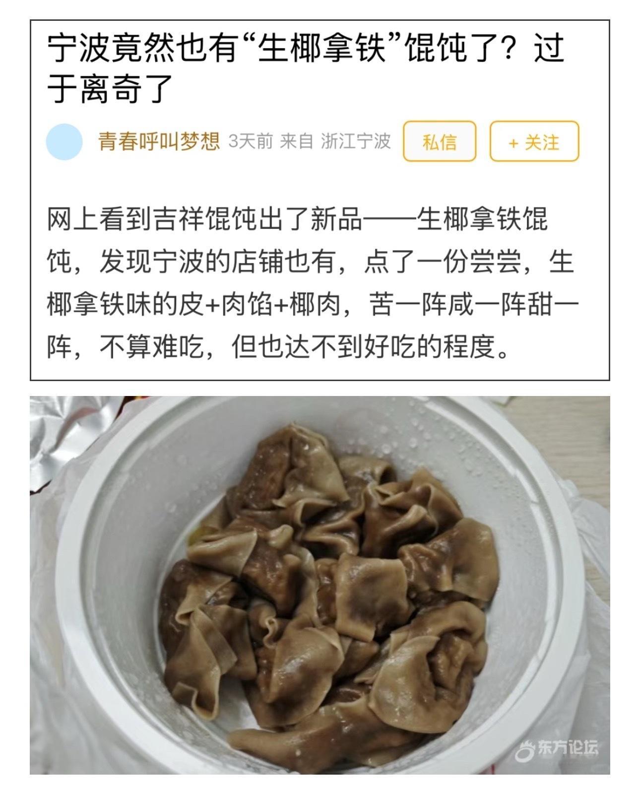宁波竟然有生椰拿铁馄饨 生椰拿铁馄饨?宁波也有了!苦咸甜一口闷,这玩意能吃?咖啡味的馄饨,你吃过吗?如果还没有,那你可能已经跟不上餐饮界的“脑洞”了。最近,一品牌馄饨推出了一款新品——生椰拿铁馄饨。你没看错,就是那个生椰拿铁 + 馄饨。而且,宁波也有卖。