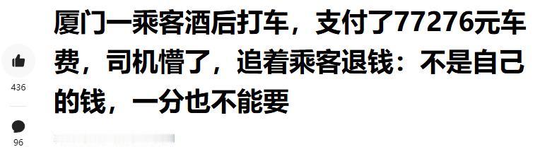 4月24日报道,厦门一乘客酒后打车,误将70多元车费付成7.7万元,司机听到微信收款提示音后,赶忙下车上前叫住乘客,司机懵了,追着乘客退钱:不是自己的钱,一分也不能要。 当天深夜,司机像往常一样在街头接单,接到了一名浑身带着酒气的乘客。乘客看起来喝得不少,脚步有些踉跄,说话也含糊不清,上车后报出目的地,就靠在座椅上闭目养神,全程没有过多言语,看得出来已经有些神志不清。 司机没有多问,只是平稳地驾驶车辆,尽量放慢车速,生怕颠簸到醉酒的乘客。一路上,他时刻留意着乘客的状态,偶尔从后视镜观察,确认乘客没有异常,才继续专注驾驶,朝着乘客报出的目的地驶去。 十几分钟后,车辆顺利抵达目的地,司机缓缓停车,轻声提醒乘客到达。醉酒的乘客迷迷糊糊地睁开眼,摸索着拿出手机,打开付款码,匆匆扫了一下司机的收款码,没有核对金额,就推开车门准备下车离开。 就在乘客关上车门、转身要走的瞬间,司机的手机突然响起了微信收款提示音,清晰的女声播报着收款金额,听到数字的那一刻,司机整个人都懵了,手里的方向盘都顿了一下,以为自己听错了。 他连忙拿起手机查看,屏幕上清晰显示着收款77000元,足足比原本70多元的车费多了上千倍。确认无误后,司机没有丝毫迟疑,立刻熄火车子,推开车门就朝着乘客的方向快步追去,生怕乘客走远,再也找不到人。 此时乘客已经走出了十几米远,脚步依旧踉跄,丝毫没有意识到自己付错了钱。司机一边追赶,一边大声呼喊,试图叫住乘客,脸上满是焦急,心里只想着尽快追上对方,把多付的钱退回去,不敢有丝毫耽误。 追了几十米后,司机终于追上了乘客,连忙伸手轻轻拉住对方的胳膊,示意他停下。醉酒的乘客被拉住,脸上露出些许不耐烦,还没完全清醒,丝毫没意识到自己犯下的错误,依旧昏昏沉沉的。 司机稳住心神,放缓语气,耐心示意乘客拿出手机核对付款金额,一边展示自己的收款记录,一边示意对方查看自己的付款记录。直到这时,乘客才慢慢清醒过来,低头看着手机屏幕,整个人也瞬间懵了。 乘客看着手机上的付款记录,又看了看司机手机上的收款记录,终于反应过来自己误将70多元的车费,付成了7.7万元,脸上瞬间露出慌乱和愧疚的神情,连忙向司机道歉,语气里满是感激。 司机没有责怪乘客,只是笑着安抚,让他不用着急,随后就拿出手机,准备将多付的钱退还给乘客。可由于退款金额过大,微信支付出现限制,无法一次性退回,司机便耐心操作,一笔一笔慢慢退还。 司机表示,自己开出租车谋生,赚的都是辛苦钱,每一分都来得不容易,所以更明白不是自己的钱,坚决不能要。哪怕金额再大,也不能违背自己的良心,守住诚信,才是最重要的。 退款完成后,乘客彻底清醒,紧紧握住司机的手,反复表达感谢,若不是司机及时发现、主动追着退钱,自己损失的7.7万元很难追回。看着司机真诚的模样,乘客心里满是温暖和感动。 司机送走乘客后,才重新回到车上,继续接单。他没有把这件事放在心上,依旧像往常一样,认真驾驶、贴心服务每一位乘客,只是偶尔有人问起,才会轻描淡写地提起这件事。 后来,这件事被知情人士分享到网上,很快就刷屏全网,网友们纷纷为司机的诚信行为点赞,称赞他是最真诚的司机,在巨额金钱面前,守住了自己的良心,用简单的举动,传递出最动人的诚信力量。 对此,你们有什么看法,欢迎评论留言~
