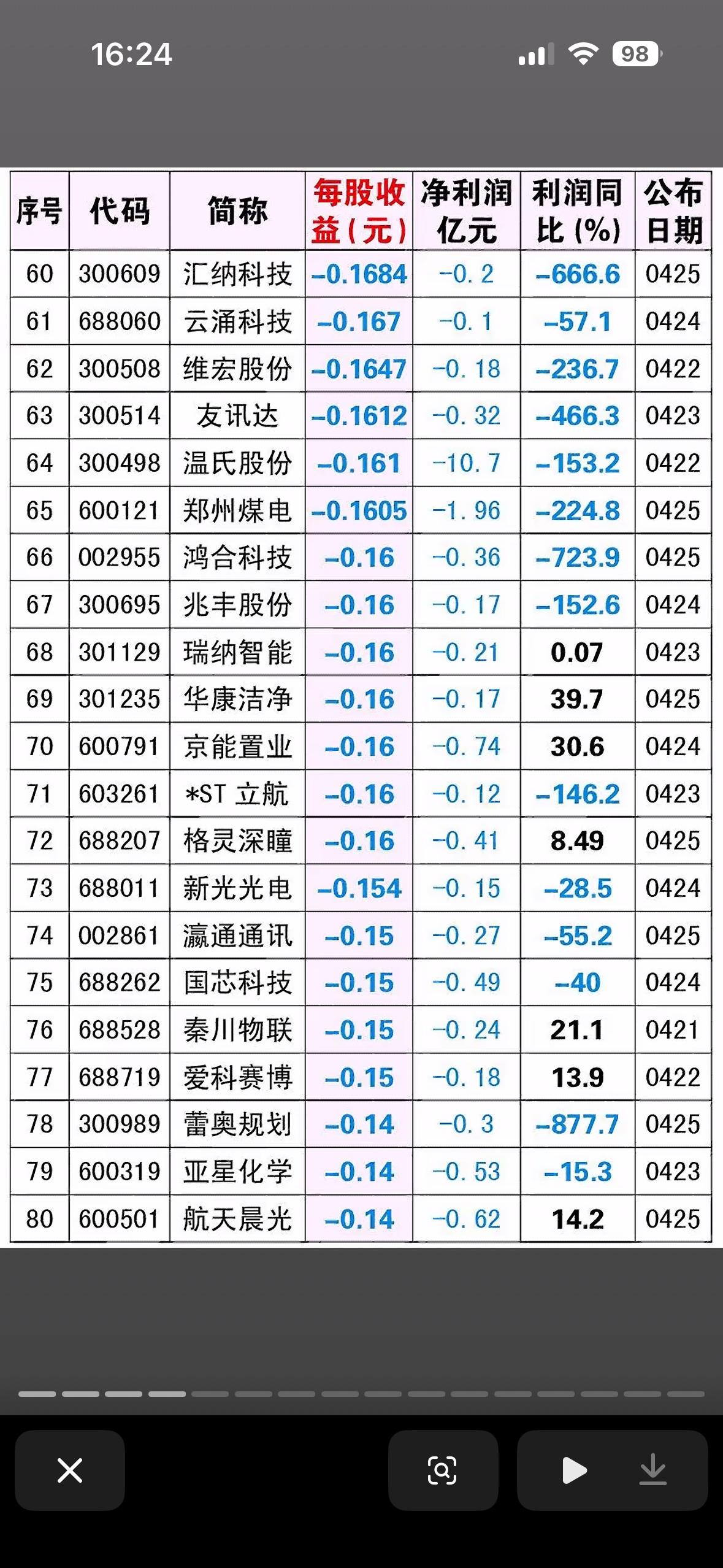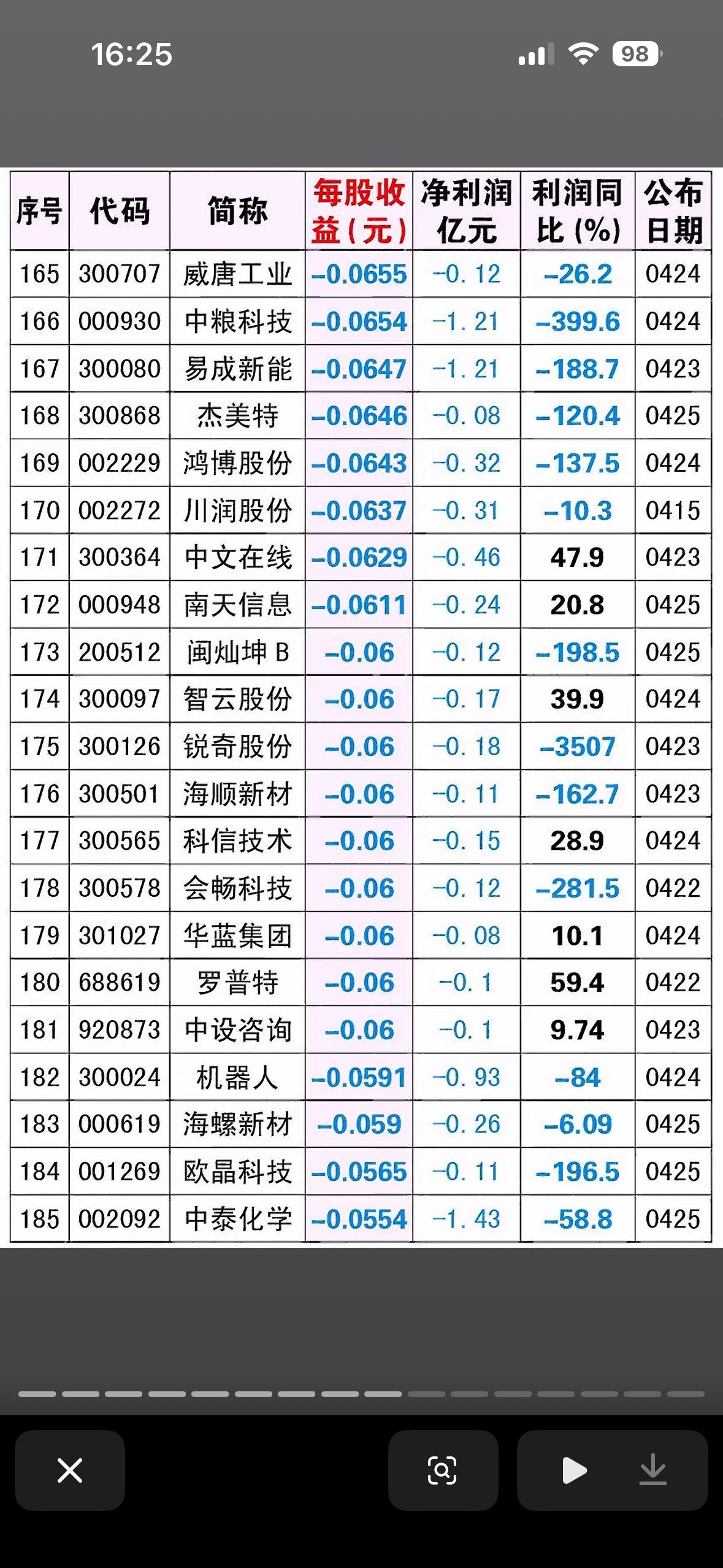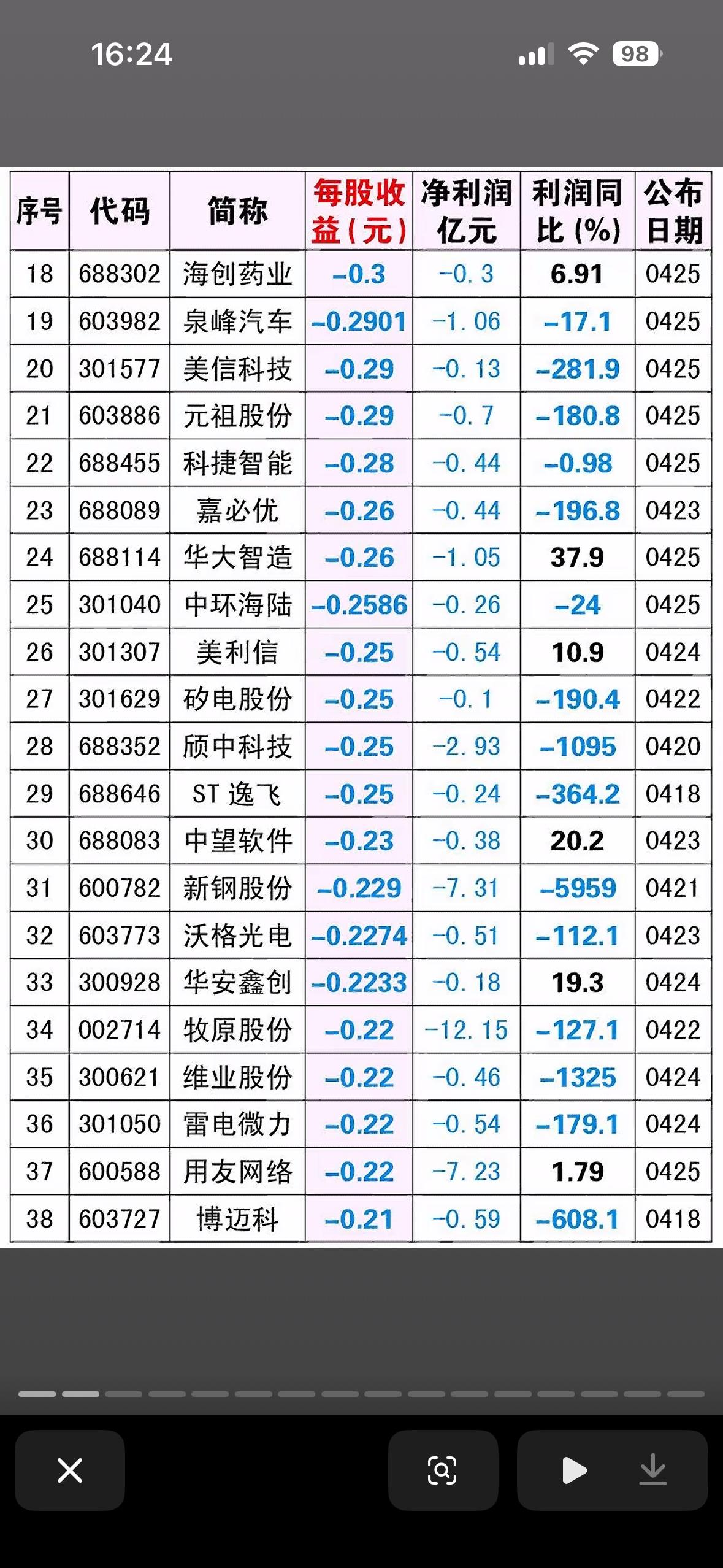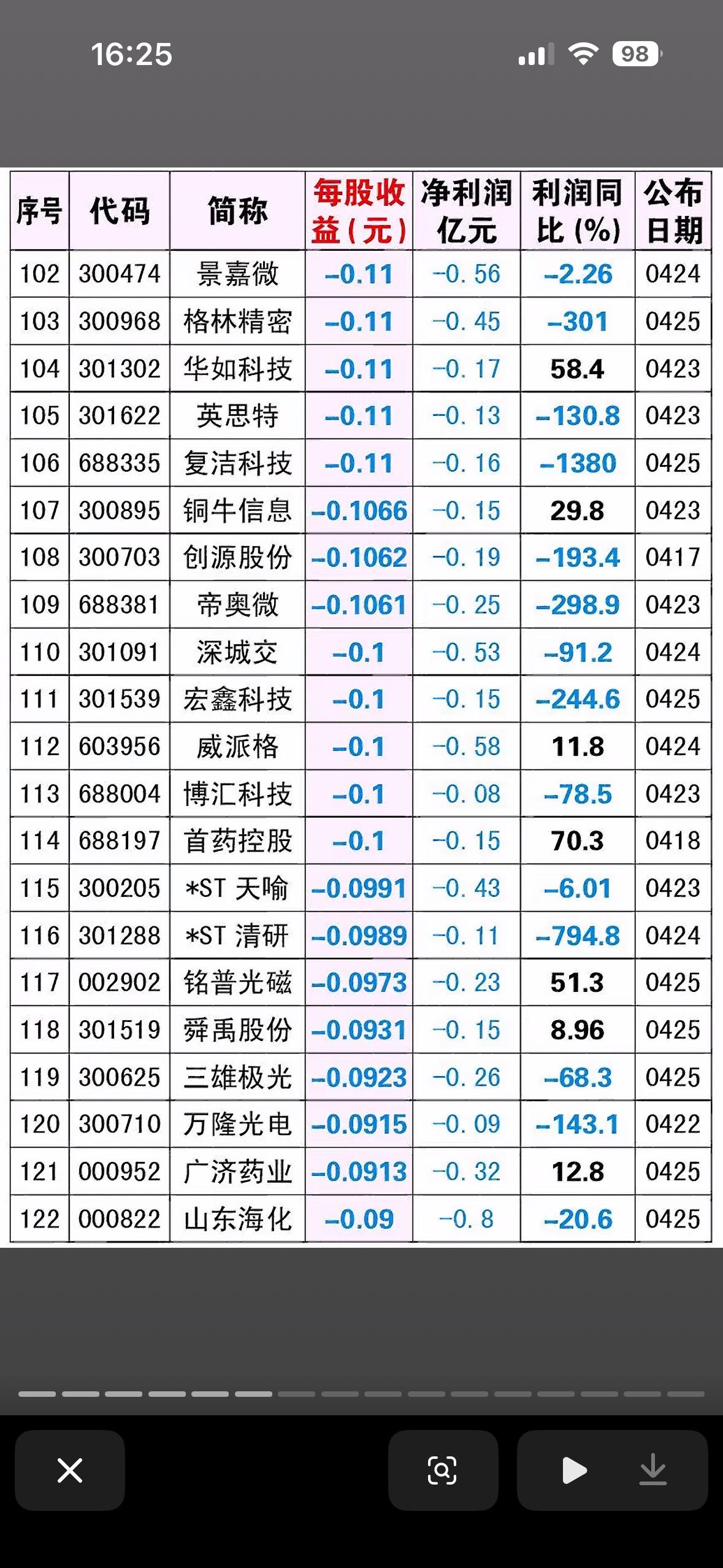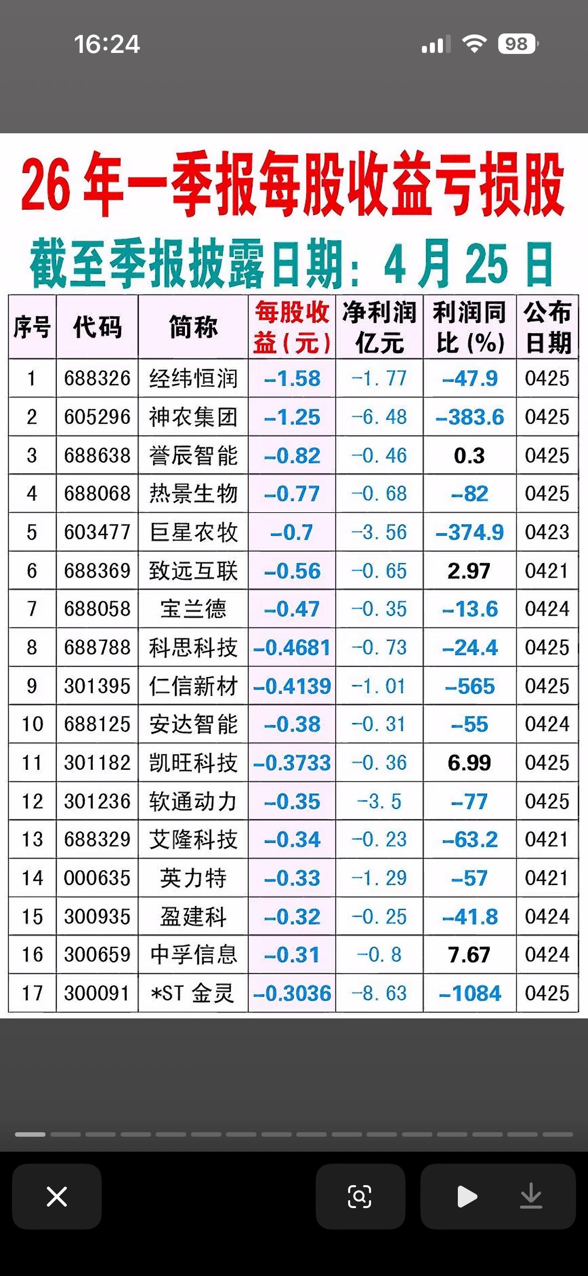 截至2026年4月25日,A股市场中已披露2026年第一季度财报的亏损股榜单。 1. 每股收益(EPS)亏损幅度 - 经纬恒润 (688326):以 -1.58元 的每股收益位居亏损榜首,净利润为-1.77亿元,且利润同比大幅下滑 -47.9%。 - 神农集团 (605296):每股收益亏损 -1.25元,净利润亏损6.48亿元,同比下滑 -383.6%。这与猪周期的波动密切相关。 - 誉辰智能 (688638):每股收益亏损 -0.82元,虽然亏损,但利润同比微增 0.3%,说明其经营状况可能正在触底。 2. 净利润同比变化 —— 业绩暴雷的重灾区 榜单中多家公司出现了大幅度的利润下滑,甚至亏损加剧: - *ST 金灵 (300091):利润同比暴跌 -1084%,亏损高达8.63亿元。作为带星ST的股票,其退市风险极高。 - 仁信新材 (301395):利润同比下滑 -565%,亏损1.01亿元。 - 巨星农牧 (603477):利润同比下滑 -374.9%,亏损3.56亿元。同样受猪周期影响。 - 软通动力 (301236):利润同比下滑 -77%,亏损3.5亿元。作为鸿蒙概念股,其业绩表现与市场热度形成反差。 行业板块深度分析 1. 农林牧渔(猪周期下行) - 代表个股:神农集团、巨星农牧。 - 逻辑验证:这两家公司的巨额亏损和利润大幅下滑,印证了猪周期正处于下行阶段,养殖企业面临巨大压力。 2. 科技与软件(业绩分化) - 代表个股:经纬恒润、软通动力、致远互联。 - 逻辑验证:虽然科技板块整体热度较高,但部分公司如经纬恒润、软通动力却出现业绩下滑或亏损,说明科技行业内部也存在分化,需要甄别真正的业绩增长点。 3. 生物医药(研发与商业化压力) - 代表个股:热景生物、艾隆科技。 - 逻辑验证:这些公司处于研发投入期或商业化初期,业绩承压是常态,但也反映了生物医药行业的高风险高回报特性。 总结 这份亏损股榜单提醒投资者,在关注绩优股的同时,也要警惕业绩暴雷的风险。特别是对于周期性行业(如农林牧渔)和部分科技股,需要深入分析其基本面,避免盲目追高。