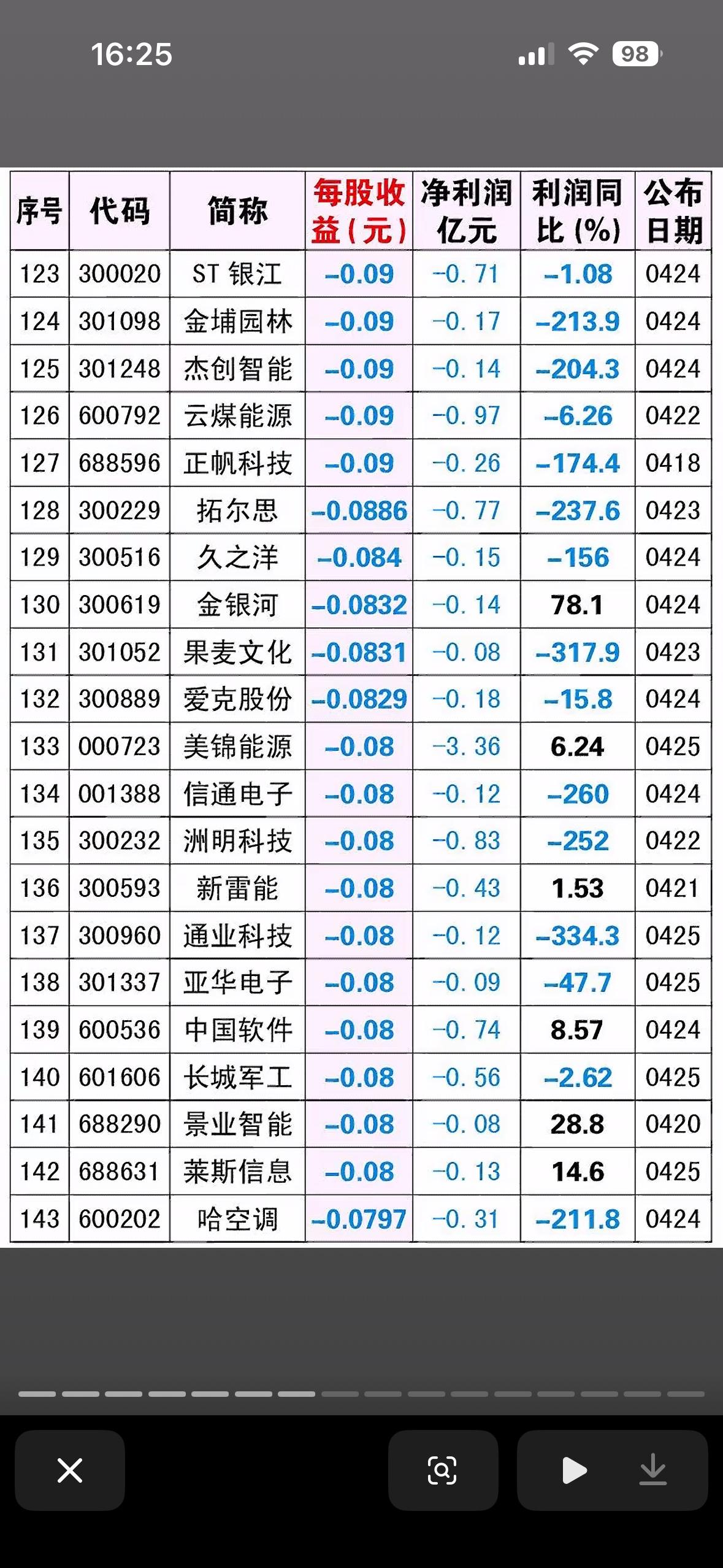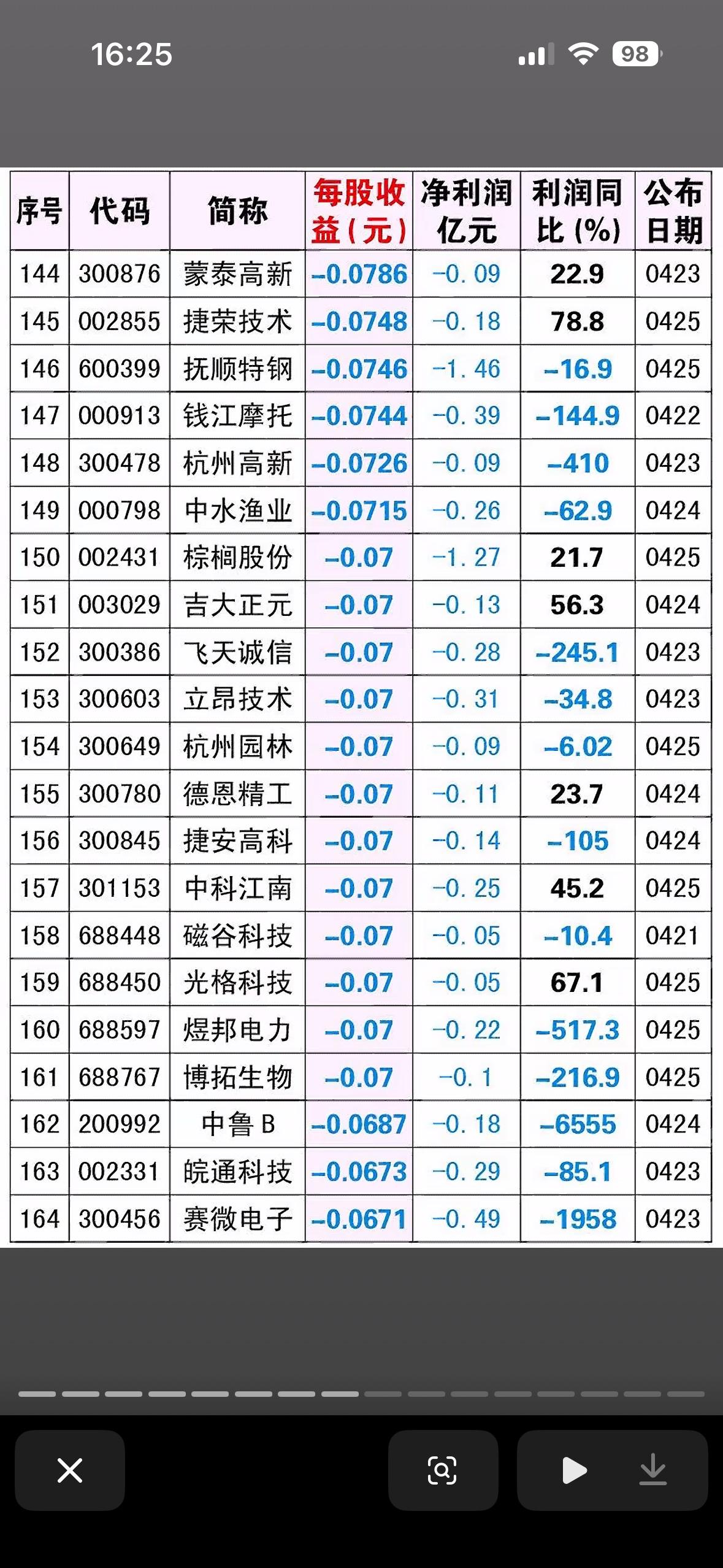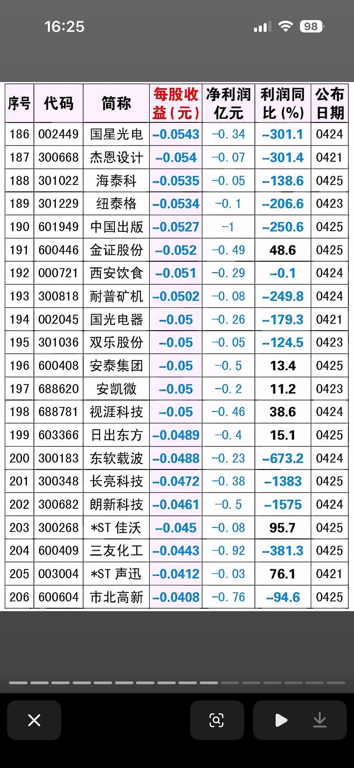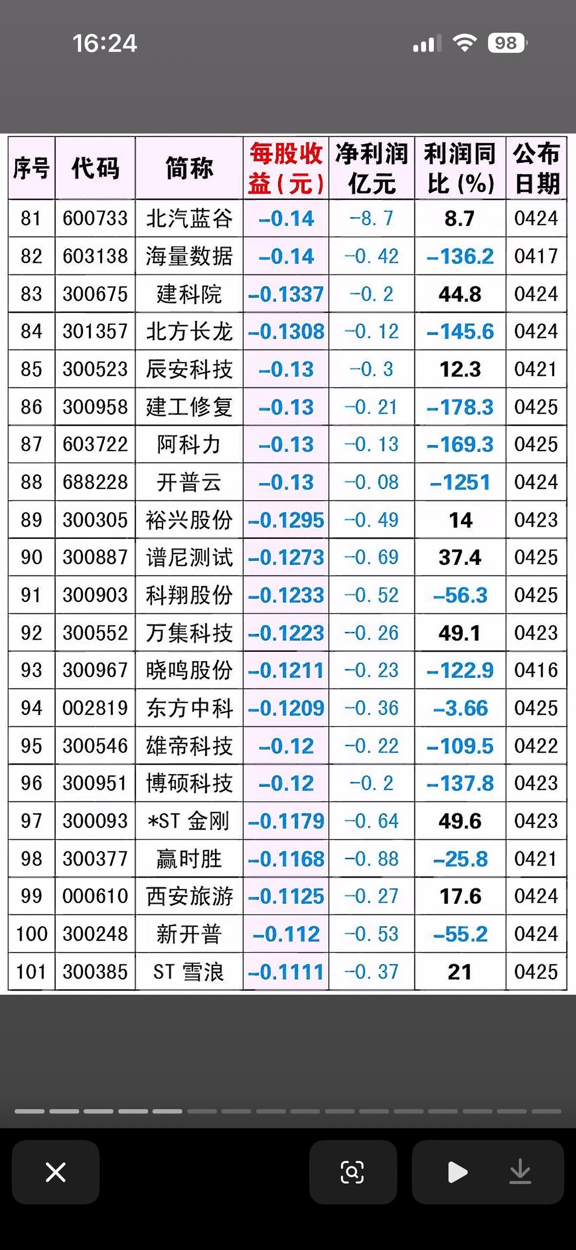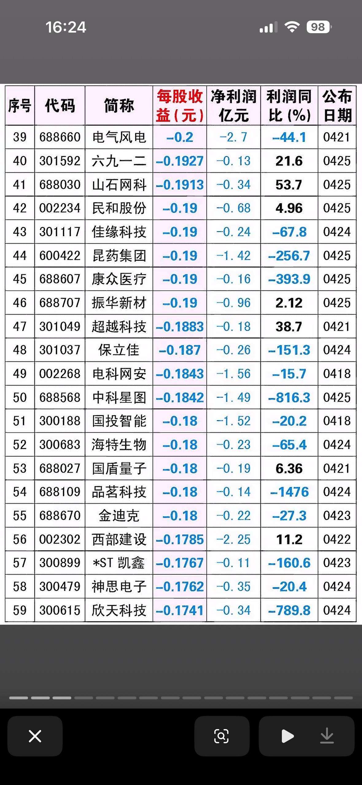 截至2026年4月25日,A股市场中已披露2026年第一季度财报的亏损股榜单。 1. 每股收益(EPS)亏损幅度 - 经纬恒润 (688326):以 -1.58元 的每股收益位居亏损榜首,净利润为-1.77亿元,且利润同比大幅下滑 -47.9%。 - 神农集团 (605296):每股收益亏损 -1.25元,净利润亏损6.48亿元,同比下滑 -383.6%。这与猪周期的波动密切相关。 - 誉辰智能 (688638):每股收益亏损 -0.82元,虽然亏损,但利润同比微增 0.3%,说明其经营状况可能正在触底。 2. 净利润同比变化 —— 业绩暴雷的重灾区 榜单中多家公司出现了大幅度的利润下滑,甚至亏损加剧: - *ST 金灵 (300091):利润同比暴跌 -1084%,亏损高达8.63亿元。作为带星ST的股票,其退市风险极高。 - 仁信新材 (301395):利润同比下滑 -565%,亏损1.01亿元。 - 巨星农牧 (603477):利润同比下滑 -374.9%,亏损3.56亿元。同样受猪周期影响。 - 软通动力 (301236):利润同比下滑 -77%,亏损3.5亿元。作为鸿蒙概念股,其业绩表现与市场热度形成反差。 行业板块深度分析 1. 农林牧渔(猪周期下行) - 代表个股:神农集团、巨星农牧。 - 逻辑验证:这两家公司的巨额亏损和利润大幅下滑,印证了猪周期正处于下行阶段,养殖企业面临巨大压力。 2. 科技与软件(业绩分化) - 代表个股:经纬恒润、软通动力、致远互联。 - 逻辑验证:虽然科技板块整体热度较高,但部分公司如经纬恒润、软通动力却出现业绩下滑或亏损,说明科技行业内部也存在分化,需要甄别真正的业绩增长点。 3. 生物医药(研发与商业化压力) - 代表个股:热景生物、艾隆科技。 - 逻辑验证:这些公司处于研发投入期或商业化初期,业绩承压是常态,但也反映了生物医药行业的高风险高回报特性。 总结 这份亏损股榜单提醒投资者,在关注绩优股的同时,也要警惕业绩暴雷的风险。特别是对于周期性行业(如农林牧渔)和部分科技股,需要深入分析其基本面,避免盲目追高。