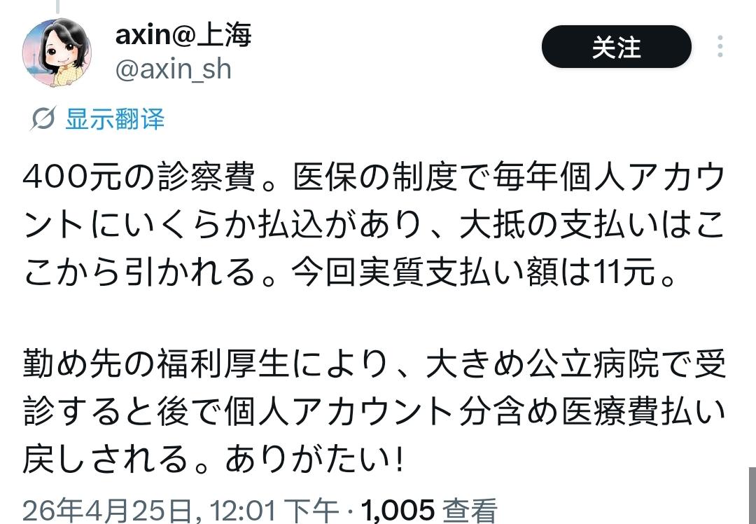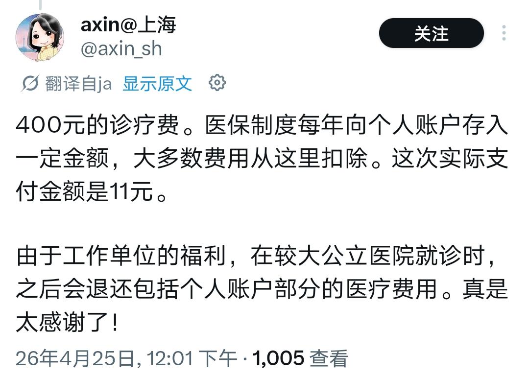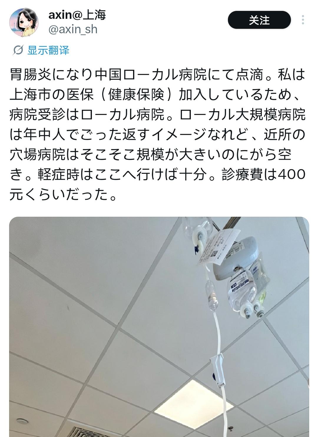 不可思议,在中国看病这么便宜! 一名在上海生活的日本人,患上急性肠胃炎,去社区医院就诊、输液治疗。 全套诊疗下来,总费用一共 400 元。 靠着医保统筹报销,最后她个人仅仅只需要承担 11 元! 不得不说,这个自付价格,放眼全世界都很难找到。 某些人总吹嘘别处健保多厉害、福利多完善。 试问同款肠胃炎、一样的输液治疗,就算有万能健保,能做到只花十几块吗? Source: X
