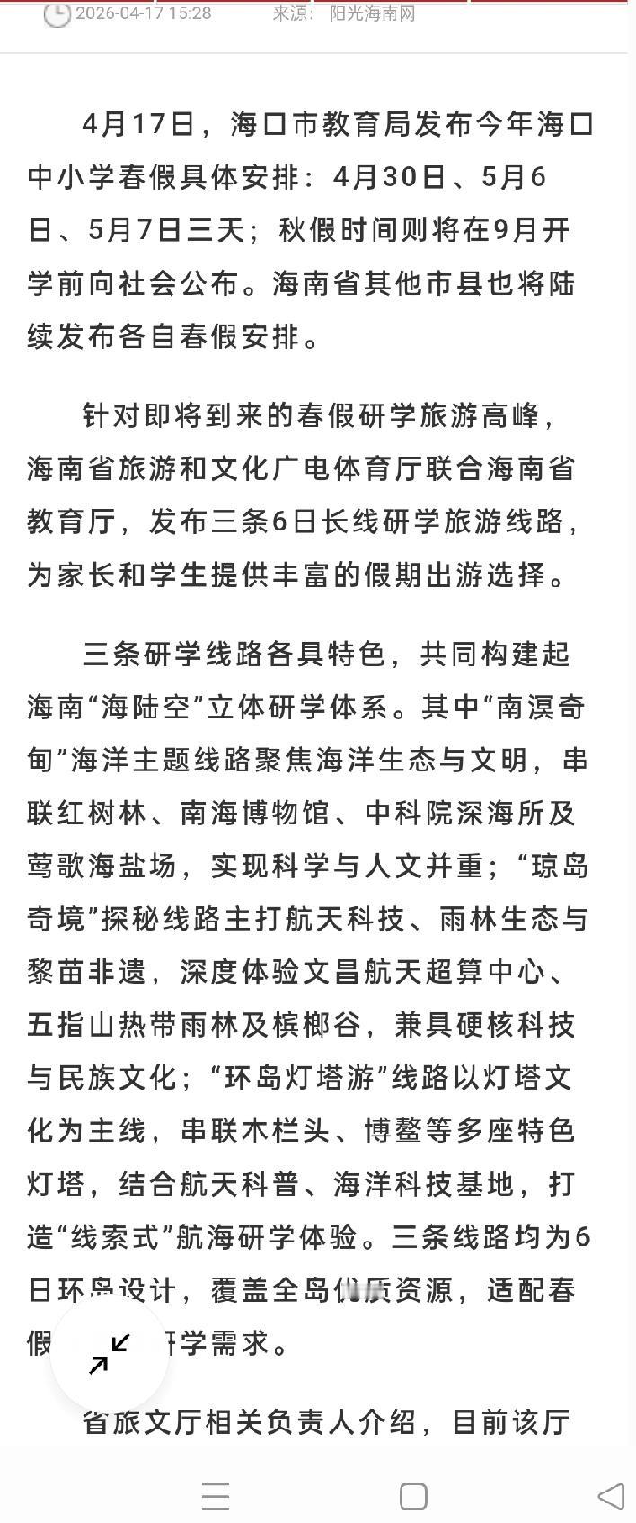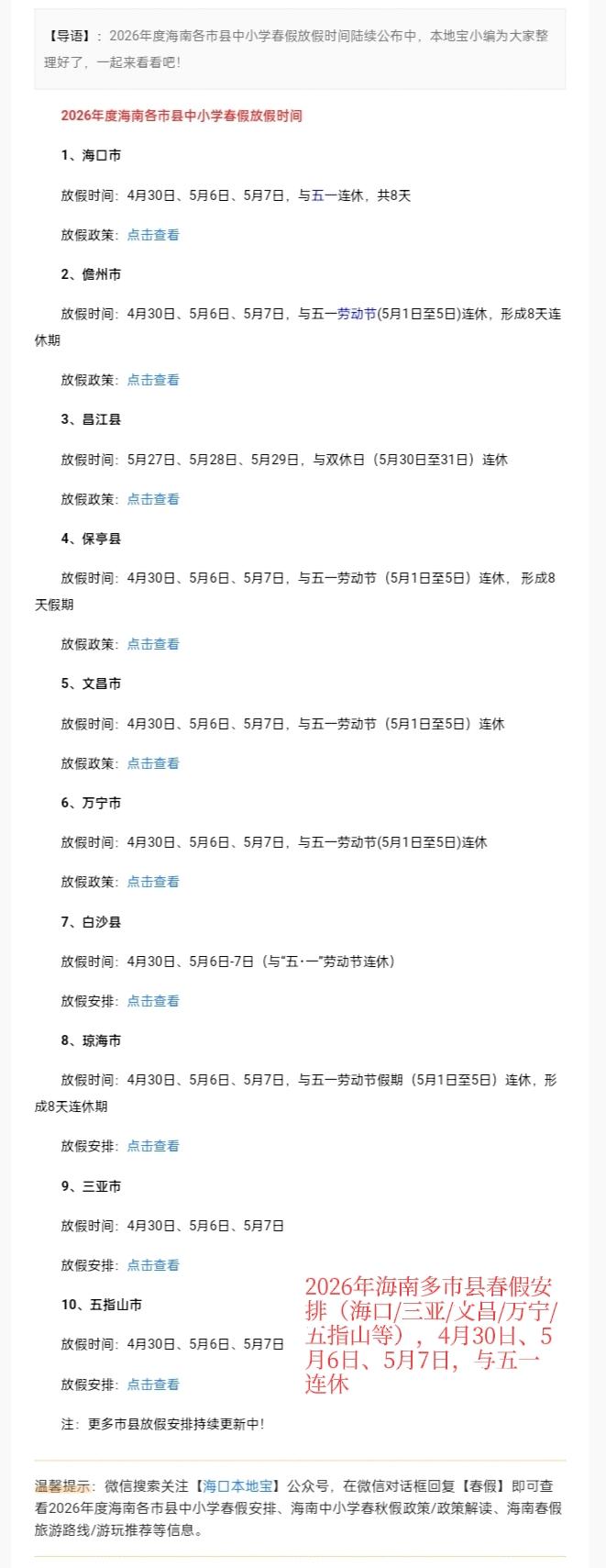 【海南中小学春假定了!连休8天?三亚、海口具体日期公布,家长速看】老铁们,前两天我一个海口的朋友在群里发牢骚:“这才开学没多久,又听说要放什么‘春秋假’,孩子倒是高兴了,我们双职工哪有时间陪啊?”结果消息一出来,群里直接炸了锅。 关于海南中小学春秋假这事,省教育厅等部门已经发了通知,从今年开始就全面推开。老牛连夜翻了各地的安排和配套政策,今天给咱们家长朋友们好好拆解拆解,看完这篇你把安排做得妥妥的。 【关于怎么放,各市县的具体安排】 首先大家最关心的是啥时候放。根据省教育厅等十二部门联合印发的通知,春秋假一般安排在春季学期和秋季学期的期中时段(4—5月、10—11月),每次3天假期。具体日子由各市县自己定,不统一假期时间,这就是为了更灵活、错开一些。 这几天群里问得最勤的三亚、海口、文昌、万宁,具体的春假安排都出来了,咱们直接拉出来看看: 1、三亚:春假安排在4月30日、5月6日、5月7日,与“五一”假期(5月1日至5日)连休,共8天。其中九年级原则上不安排春假,仅安排秋假,以保障复习备考的连贯性;高中阶段学校2026年暂不安排春假。幼儿园可参照执行。 2、海口:同样安排在4月30日、5月6日、5月7日,与五一连休,共8天。高中试行春秋假,其中高三年级原则上只安排秋假。各学校提供兜底托管服务,开放学校教室、图书馆、运动场馆等。 3、 文昌、万宁:也是4月30日、5月6日、5月7日,与五一连休。 4、五指山:同样安排在4月30日、5月6日、5月7日,与五一连休。 5、儋州、昌江、保亭:也已陆续公布,其中儋州、保亭安排4月30日、5月6日、5月7日,与五一连休;昌江稍晚,安排5月27日—29日与双休日连休。 要提醒一点,初三、高三毕业班原则上是不放春假的,得优先紧着备考。另外幼儿园属于鼓励参照执行,可以搞些周边亲子活动。 【给孩子支三招,不让假期变乱麻】 假期怎么安排,老牛特意向身边的教育口朋友请教了一下,给大家梳理了几个方向,保证孩子玩得痛快、家长也放心。 第一招:“身边玩”不放大假,就在家门口精致遛娃 如果你觉得连休太累,或者暂时走不开,不用硬跑远。学校基本会提供公益托管服务,开放图书馆、运动场馆,还有工作人员看护,绝对不是简单的关在屋里补课。另外省里的博物馆、文化馆等很多地方都对咱们孩子免费。带孩子去青少年宫、科技馆泡一天,比闷在家里打游戏强太多了。 第二招:“途中学”趁机票良心,带孩子来一场研学科考 现在正是咱们海南最舒服的季节。其实假期调整最核心的初衷,是让孩子走出小书桌,在行走中学习。省旅文厅也专门赶着春假推出了3条6日长线研学路线,给大伙当个参考: 1、 “南溟奇甸”海洋主题:从海口东寨港红树林,到文昌石头公园、博鳌南海博物馆,再到万宁海洋科技基地、中国科学院深海所,最后到儋州千年古盐田和莺歌海盐场。 2、 “琼岛奇境”航天雨林探秘:从文昌航天科普中心、航天超算中心,到五指山热带雨林国家公园、保亭槟榔谷,再到三亚亚龙湾海底世界、落笔洞遗址,最后到蜈支洲岛,硬核科技与民族文化兼具。 3、 “环岛灯塔游”线路:串联木栏头、博鳌等多座特色灯塔,结合航天科普、海洋科技基地,打造“线索式”航海研学体验。 三条线路均为6日环岛设计,覆盖全岛优质资源,适配春假及暑期研学需求。 第三招:“安心放”大人在忙,有人帮你看娃 有些亲们可能要说“五一本来就是我最忙的时候,真没精力带”。你别担心,对于双职工、留守、随迁子女家庭,如果你实在没能安排出行计划,学校会提供公益托管服务,共青团、妇联也会利用社区、青少年宫等场所,为这些家庭提供公益托管。孩子们不仅可以不落单,还能在大家一起的氛围下做手工、画画、户外活动。另外交通部门保障儿童票优先落实,省旅文厅也在联合企业推出“专属优惠包”。咱家长可以吃下这个定心丸。 最后老牛给大家来个调研:这次春假马上就要来了,你是计划趁机会带着孩子拼长假出去逛一圈(A),还是准备把娃娃放在家门口的公益托管(B),又或者干脆把孩子送回老家让老人带(C)?大伙别藏着,直接在评论区分享你的选择,让各位老铁互相取取经。觉得这篇文章对你安排假期有帮助的,别忘了转发给身边一起操心养娃的老同学、邻居群,大家信息互享一下,这心里头才更踏实! 海南中小学春秋假 2026海南春假 托管服务