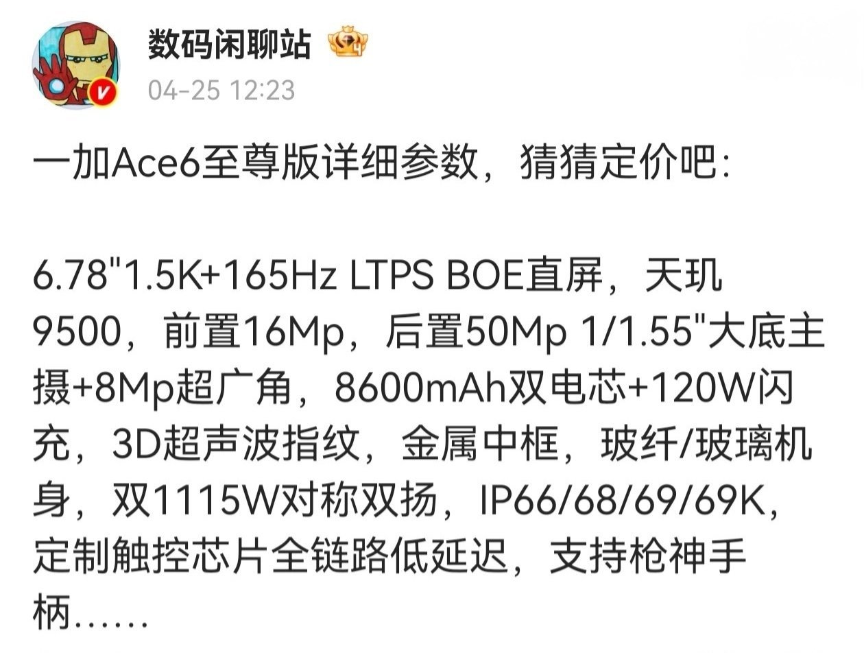 一加 Ace6 至尊版手机将于 4 月 28 日 19:00 数码闲聊站发布,博主 对新机规格进行汇总。